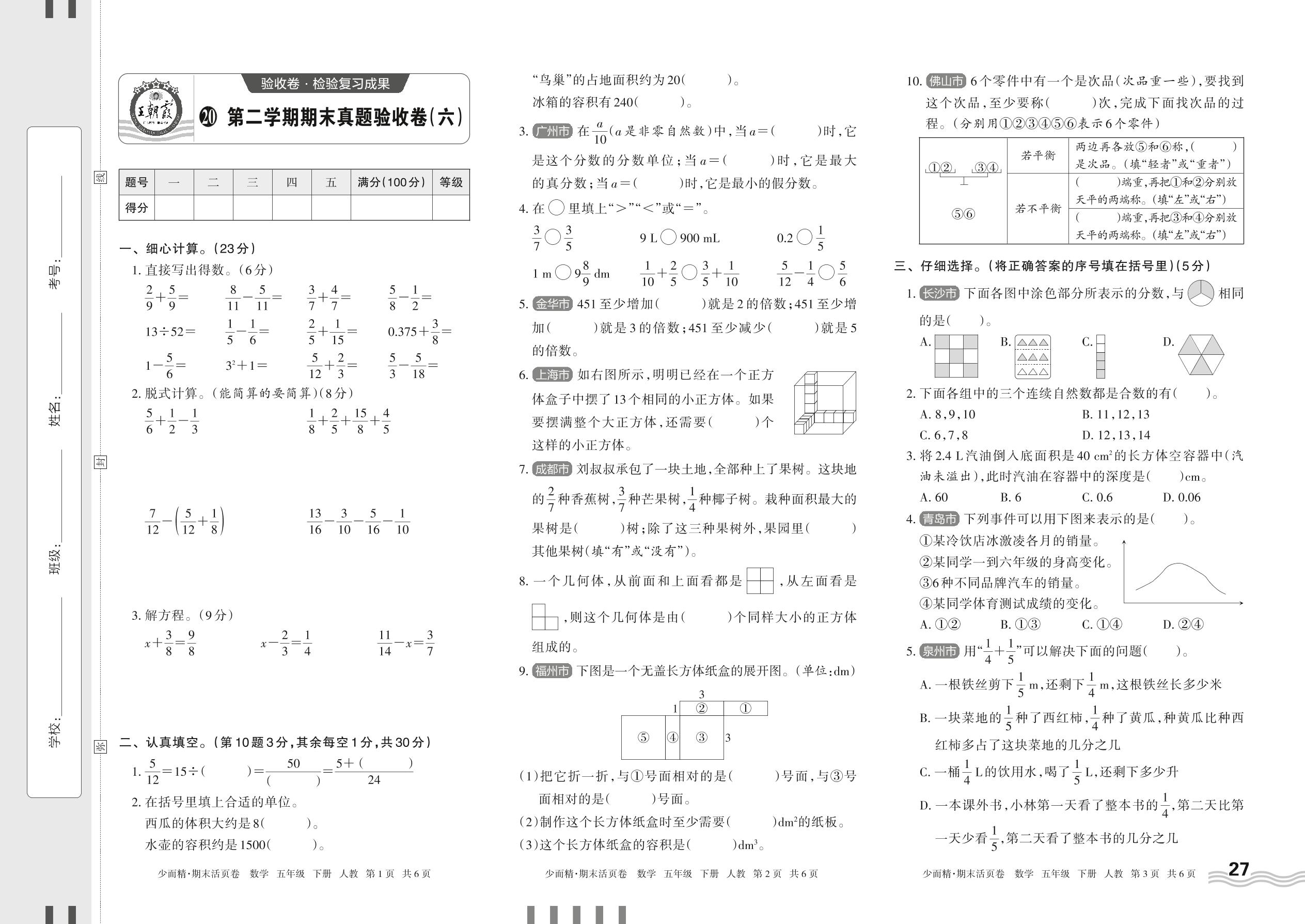 五年级数学人教版下册期末卷