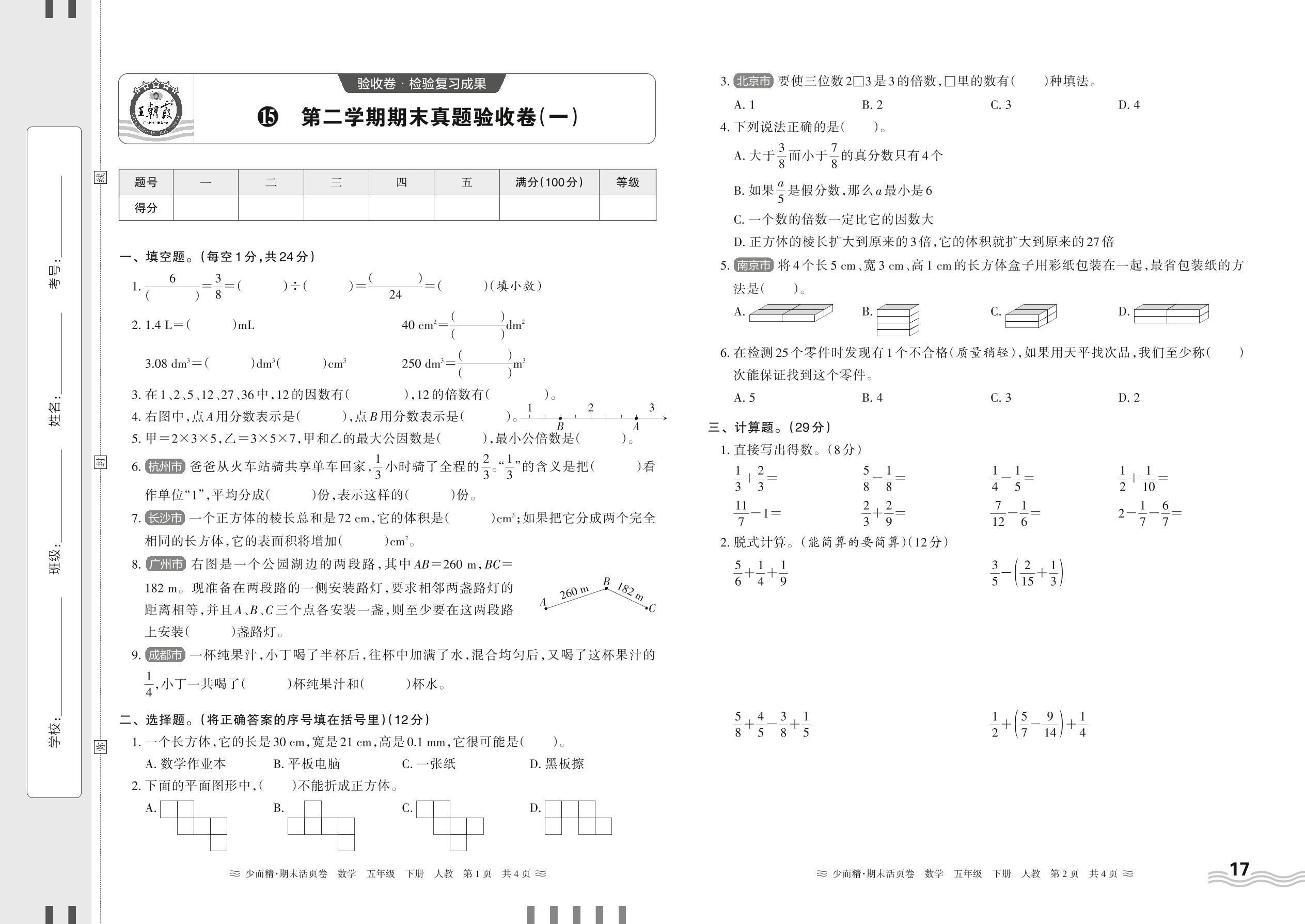 五年级数学人教版下册期末卷
