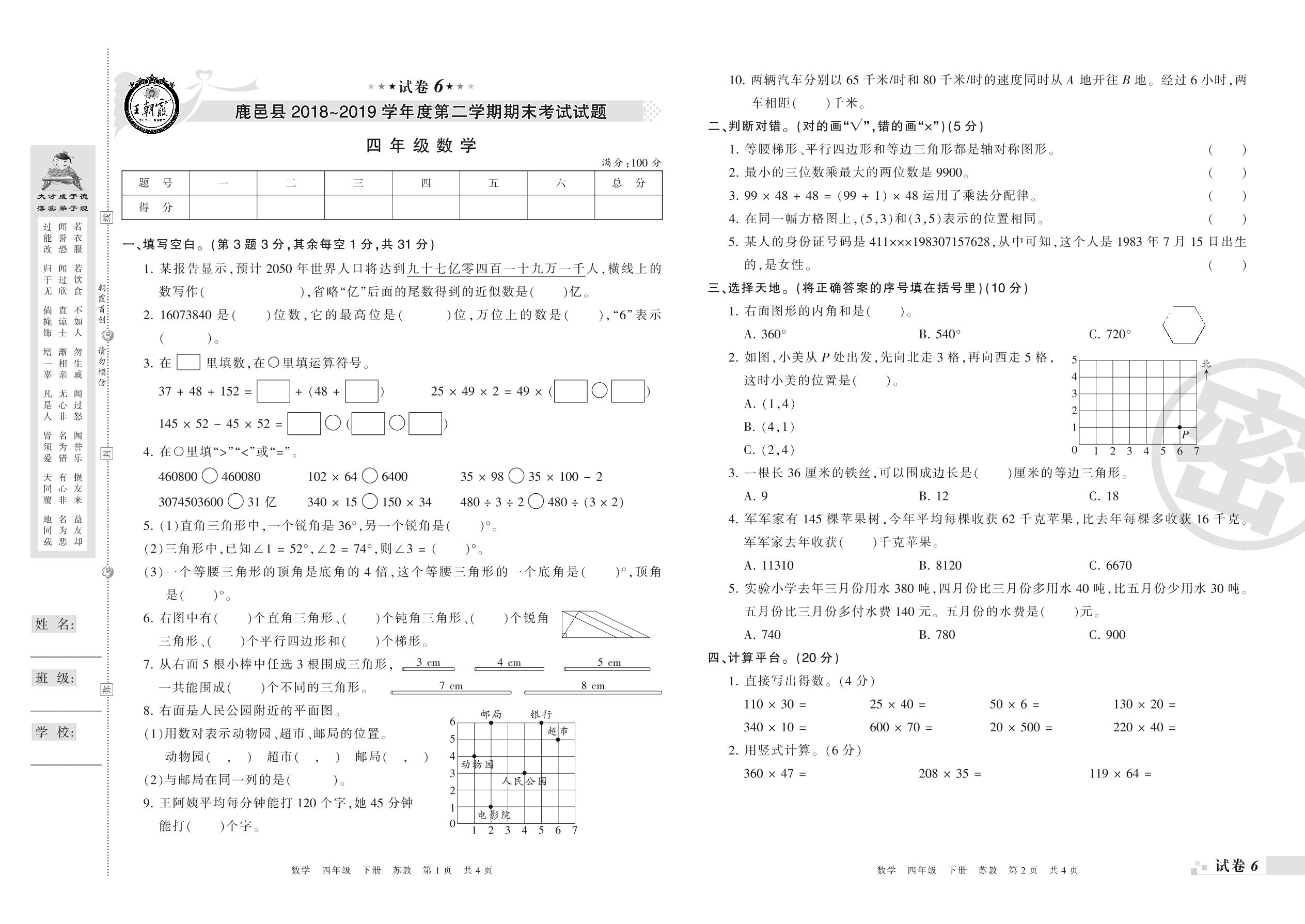 2018-2019学年第二学期周口市鹿邑县四年级数学试卷(苏教版)【6】