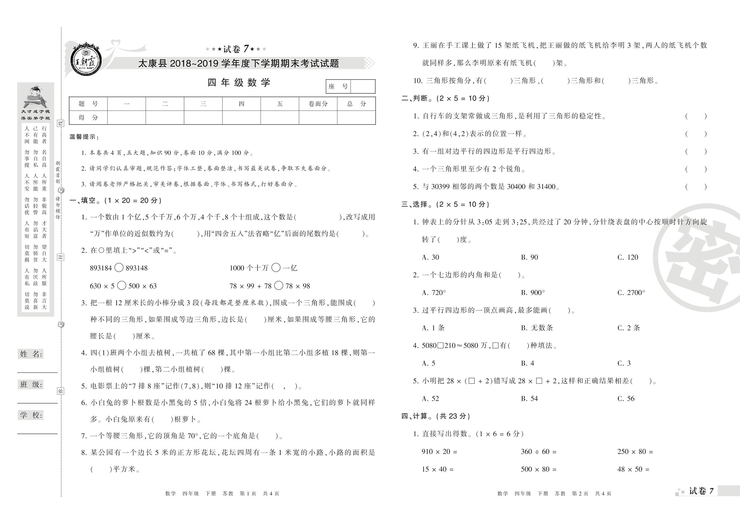 2018-2019学年第二学期周口市太康县四年级数学试卷(苏教版)【7】