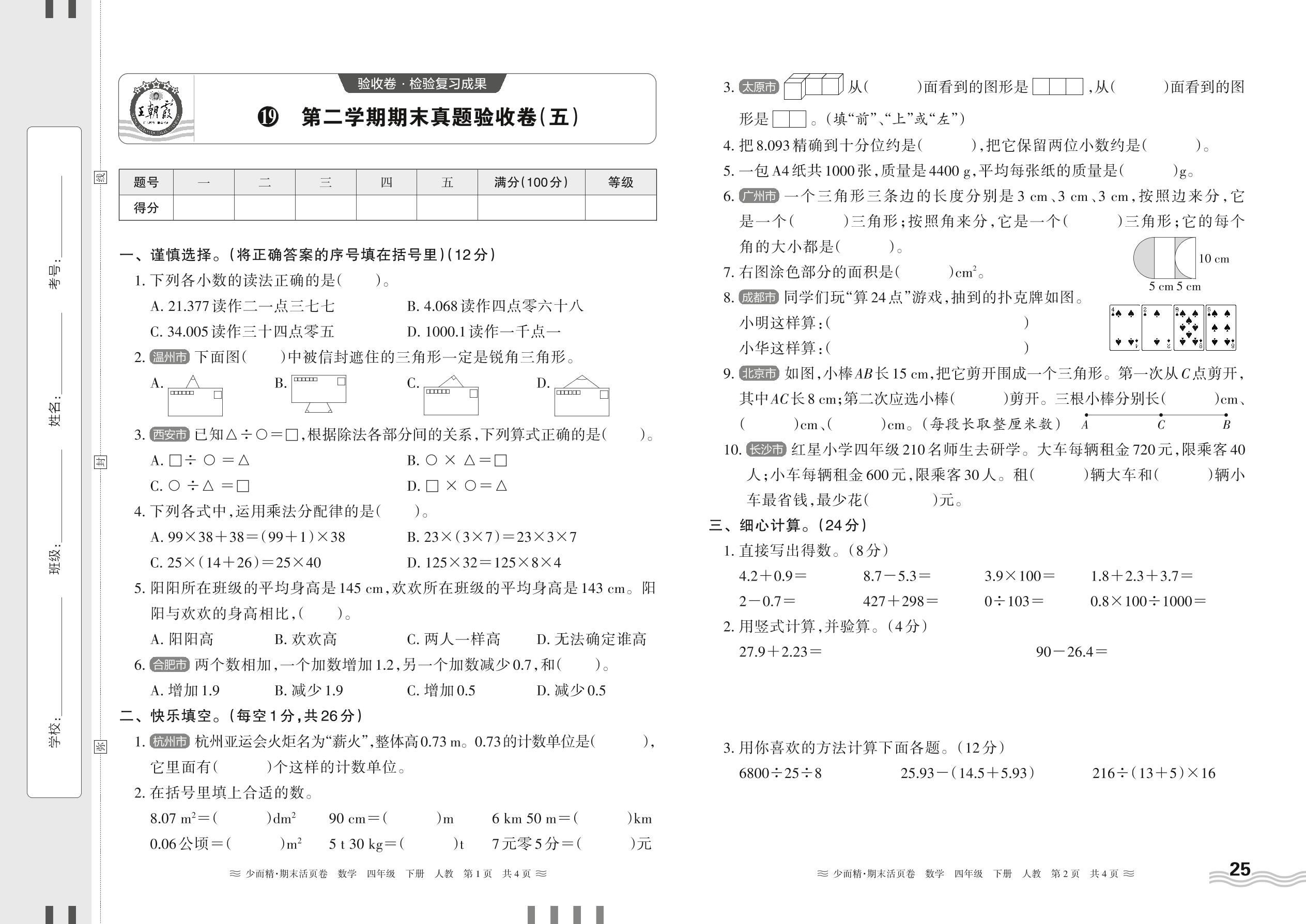 2024春下册四年级数学人教版 第二学期期末真题验收卷(五)