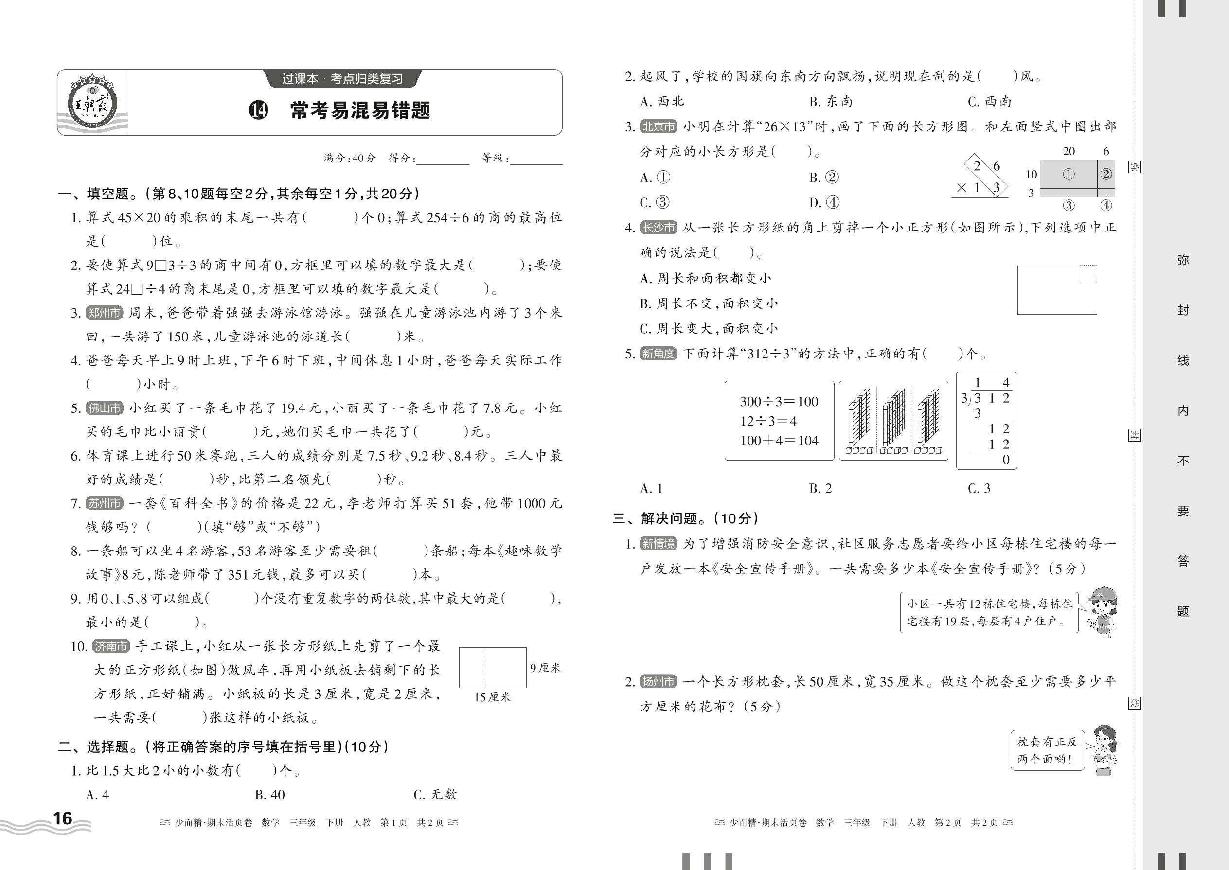 2024春下册三年级数学人教版 期末过课本HY版·常考易混易错题【14】