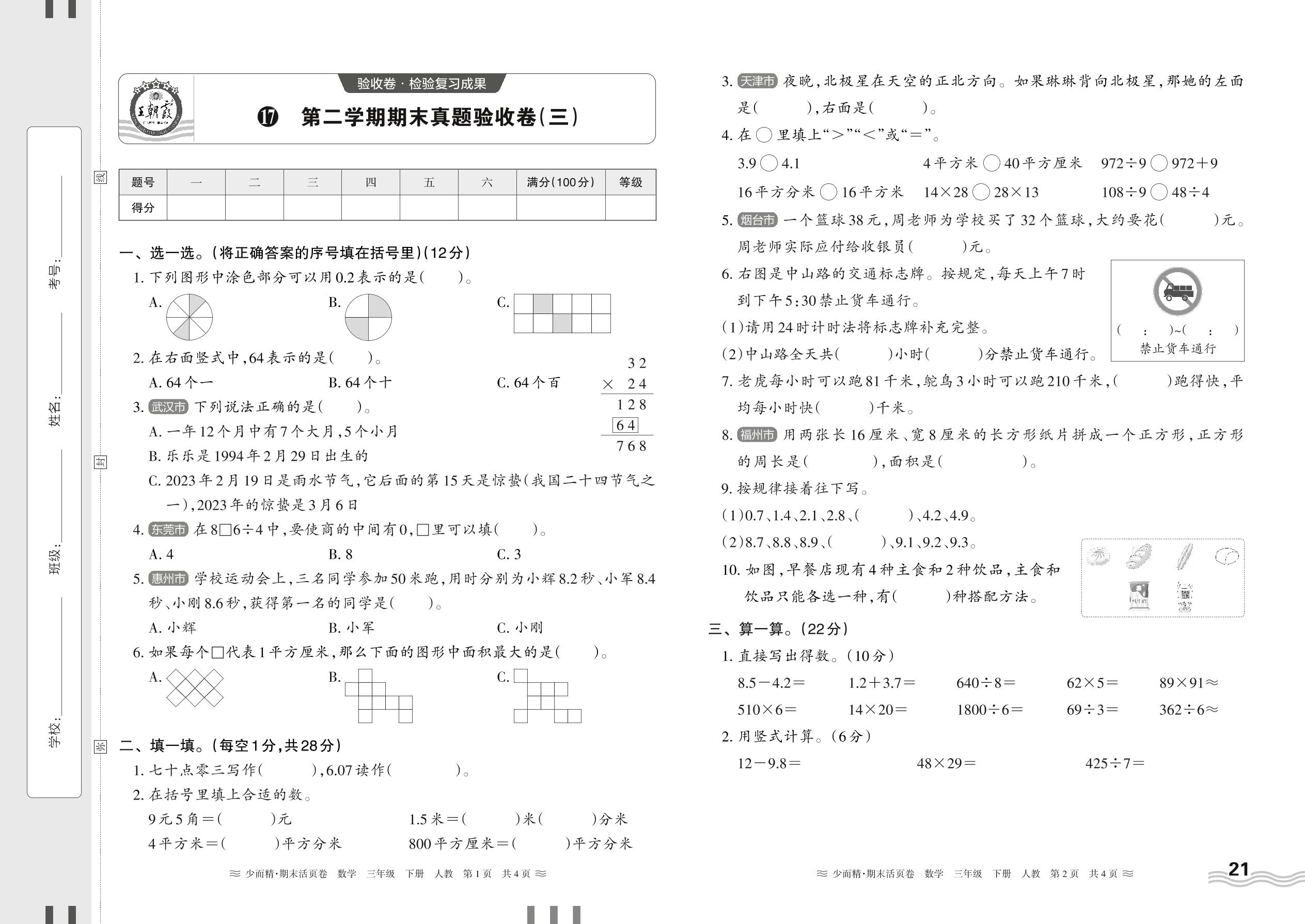 2024春下册三年级数学人教版 第二学期期末真题验收卷(三)