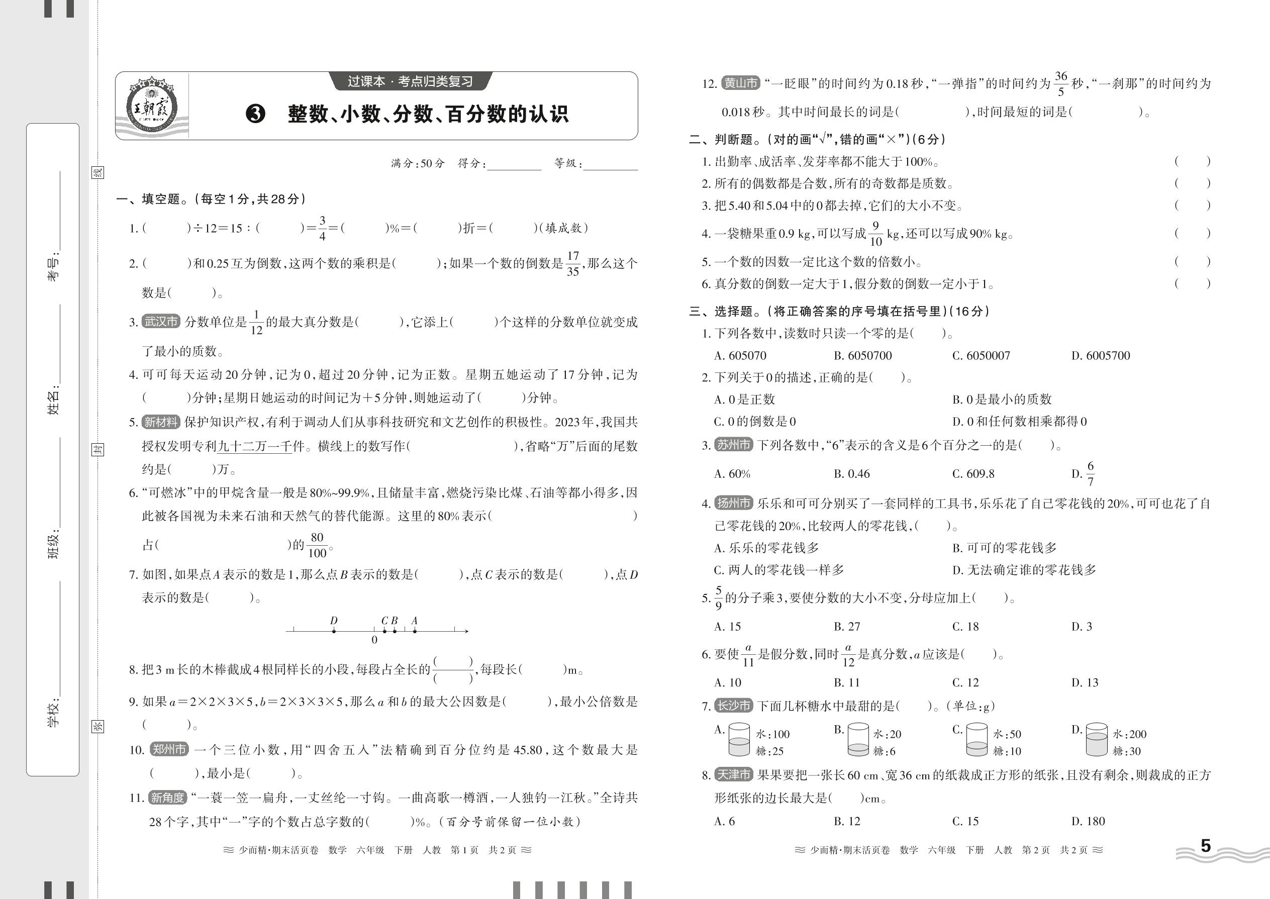 2024春下册六年级数学人教版 期末过课本HY版·整数、小数、分数、百分数的认识【3】