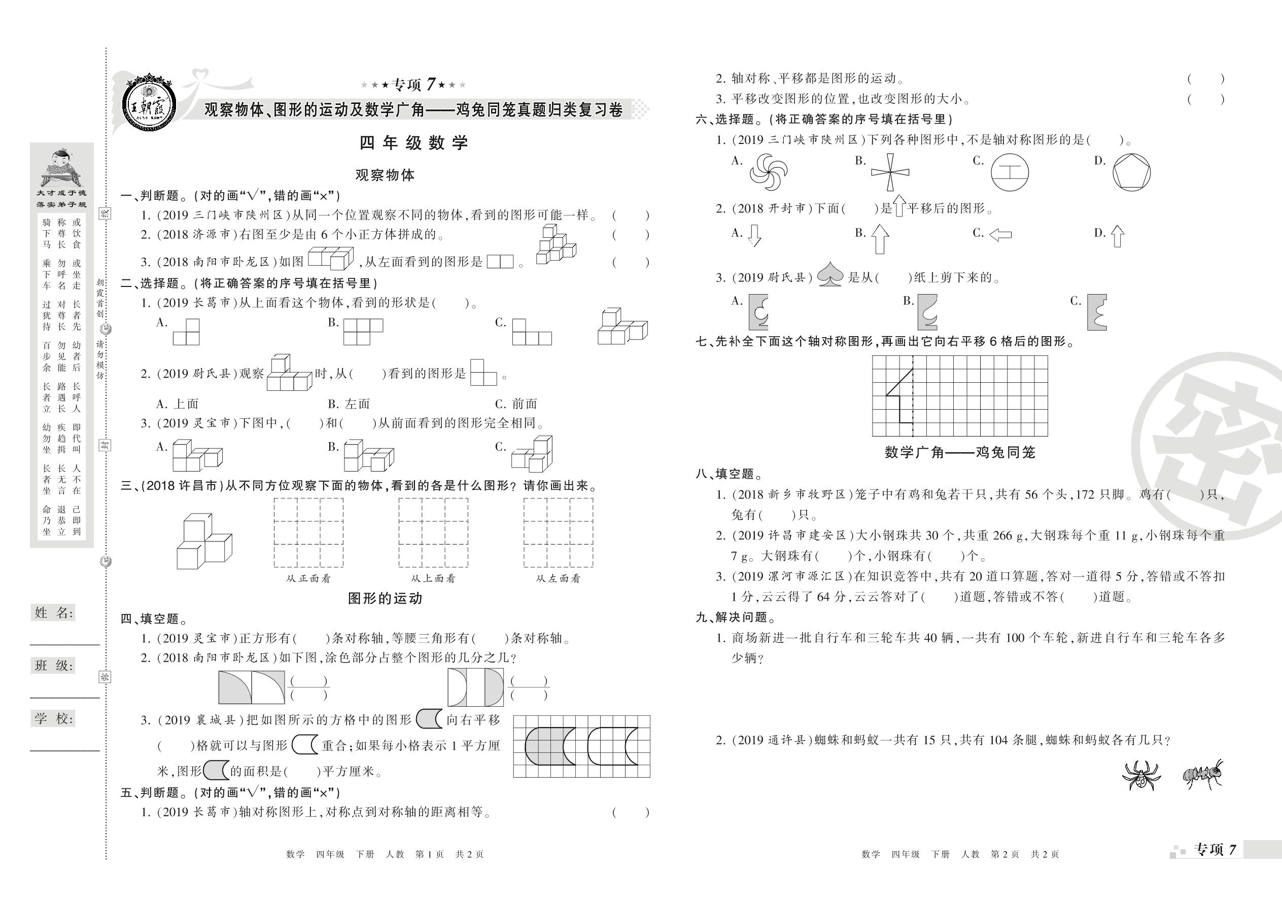 王朝霞期末专项卷——观察物体、图形的运动及数学广角:鸡兔同笼真题归类复习卷、新颖题速递:生活与数学四年级下册数学(人教版)_R210804143704【0】