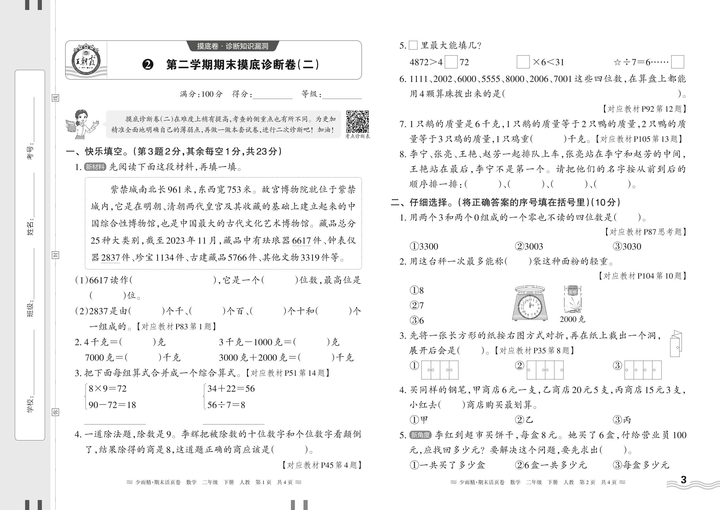 2024春下册二年级数学人教版 第二学期期末摸底诊断卷(二)