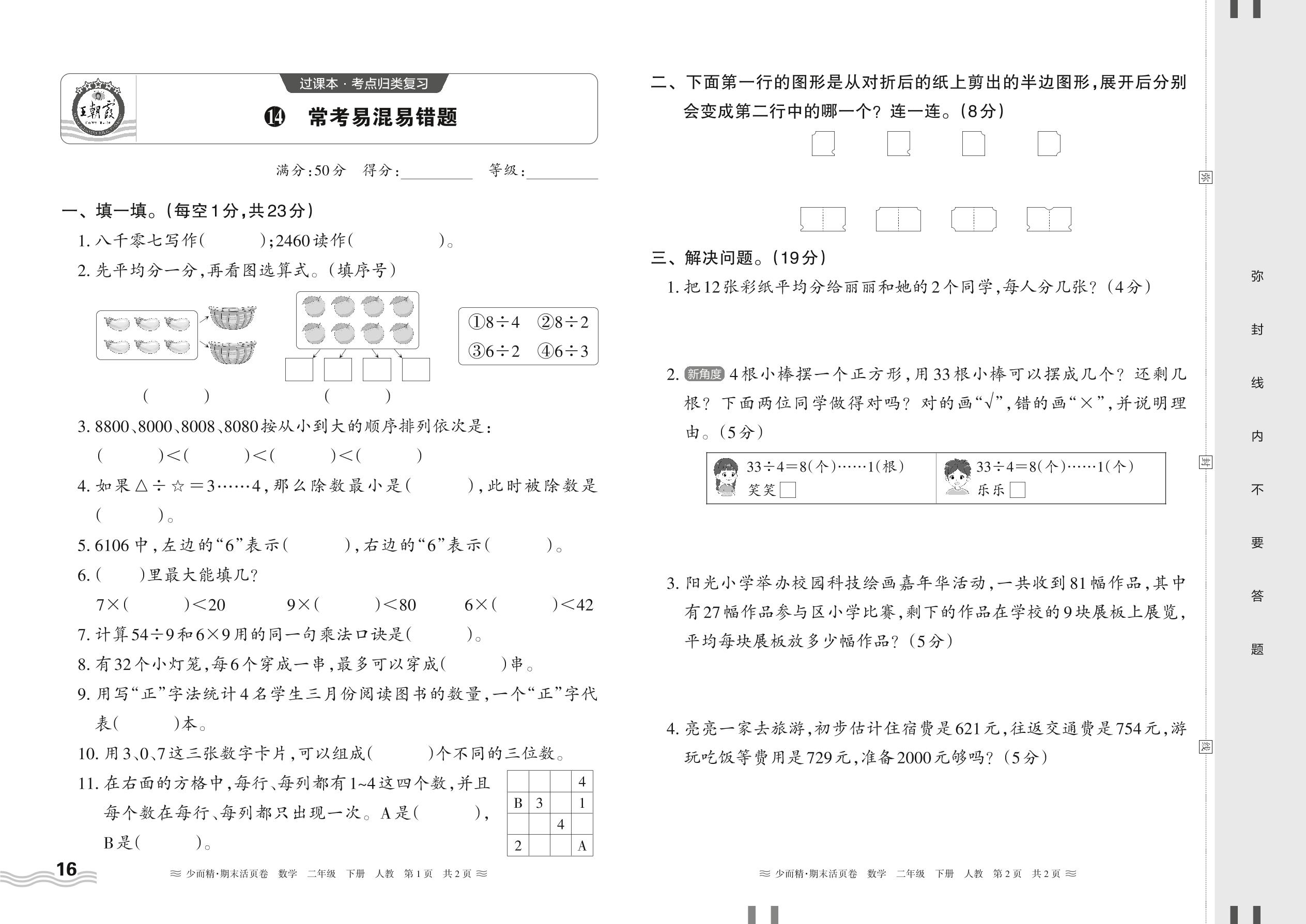 2024春下册二年级数学人教版 期末过课本HY版·常考易混易错题【14】