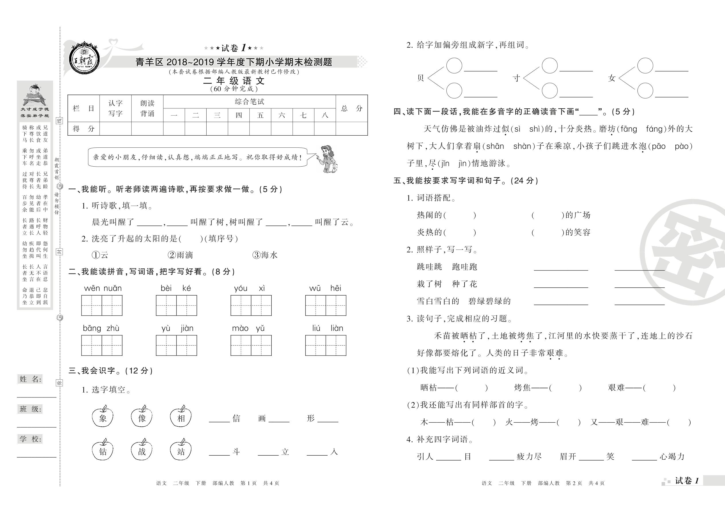 2018-2019学年第二学期成都市青羊区二年级语文试卷(人教版)【1】