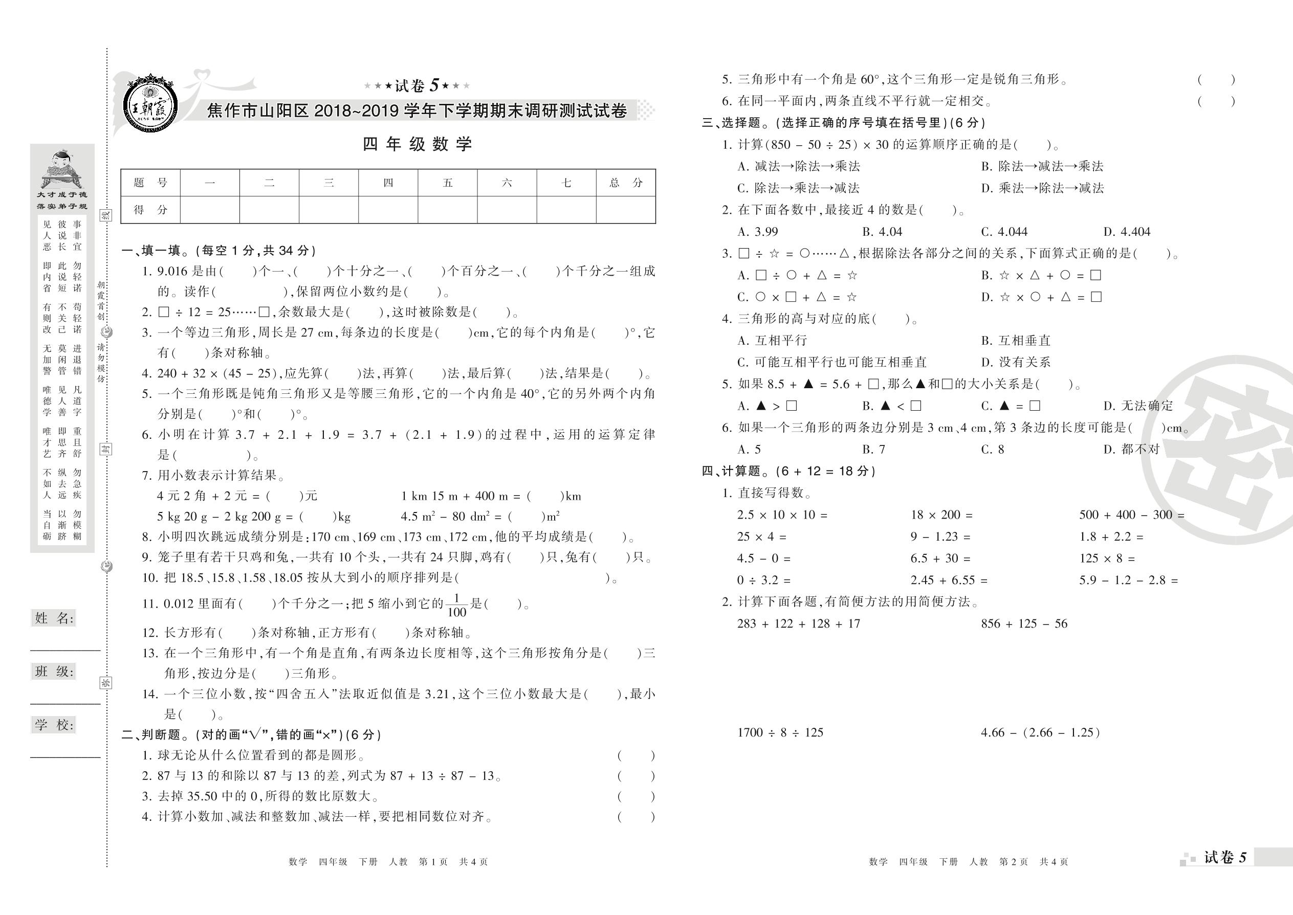 2018-2019学年第二学期焦作市山阳区四年级数学试卷(人教版)【5】