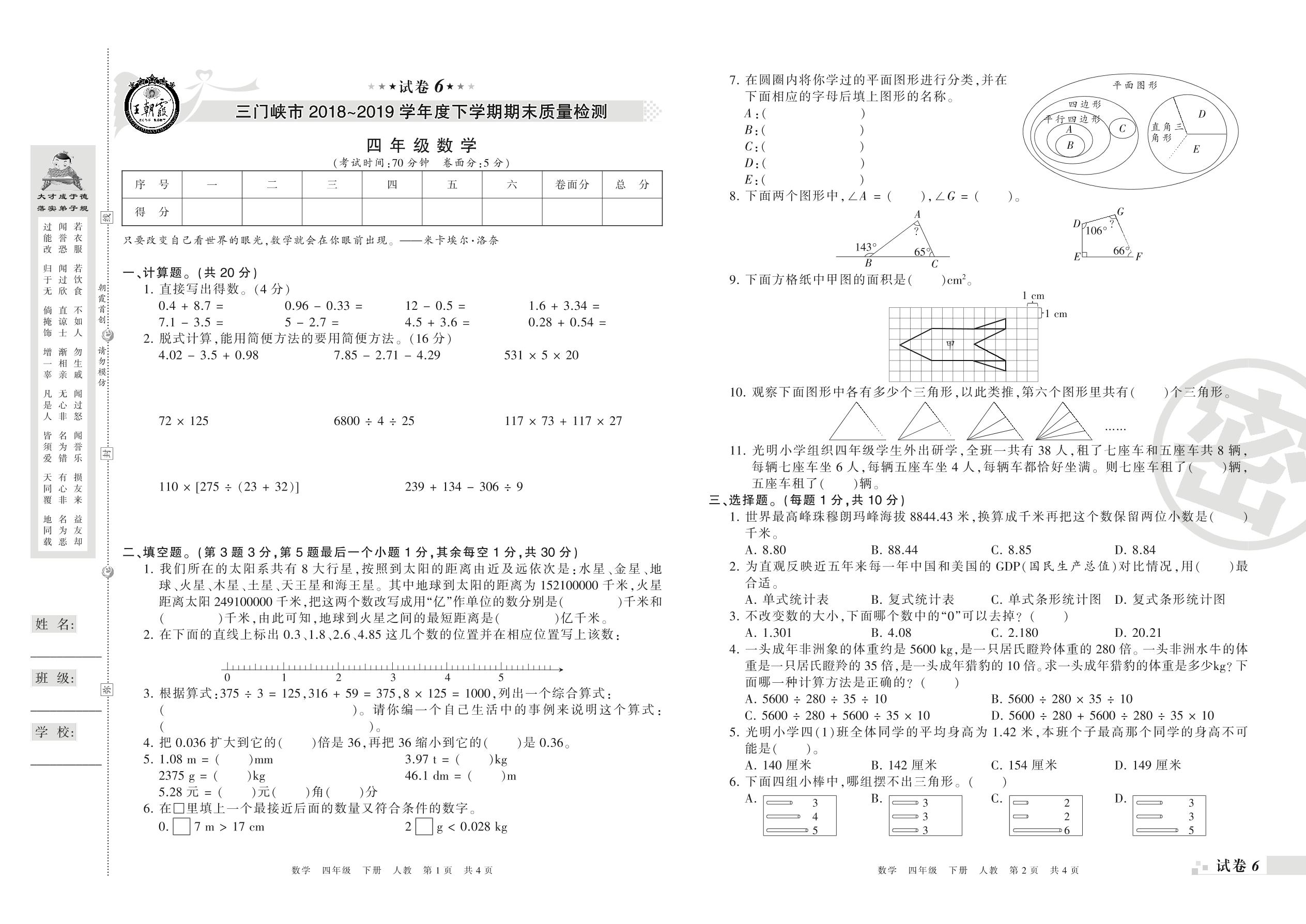 2018-2019学年第二学期三门峡市四年级数学试卷(人教版)【6】
