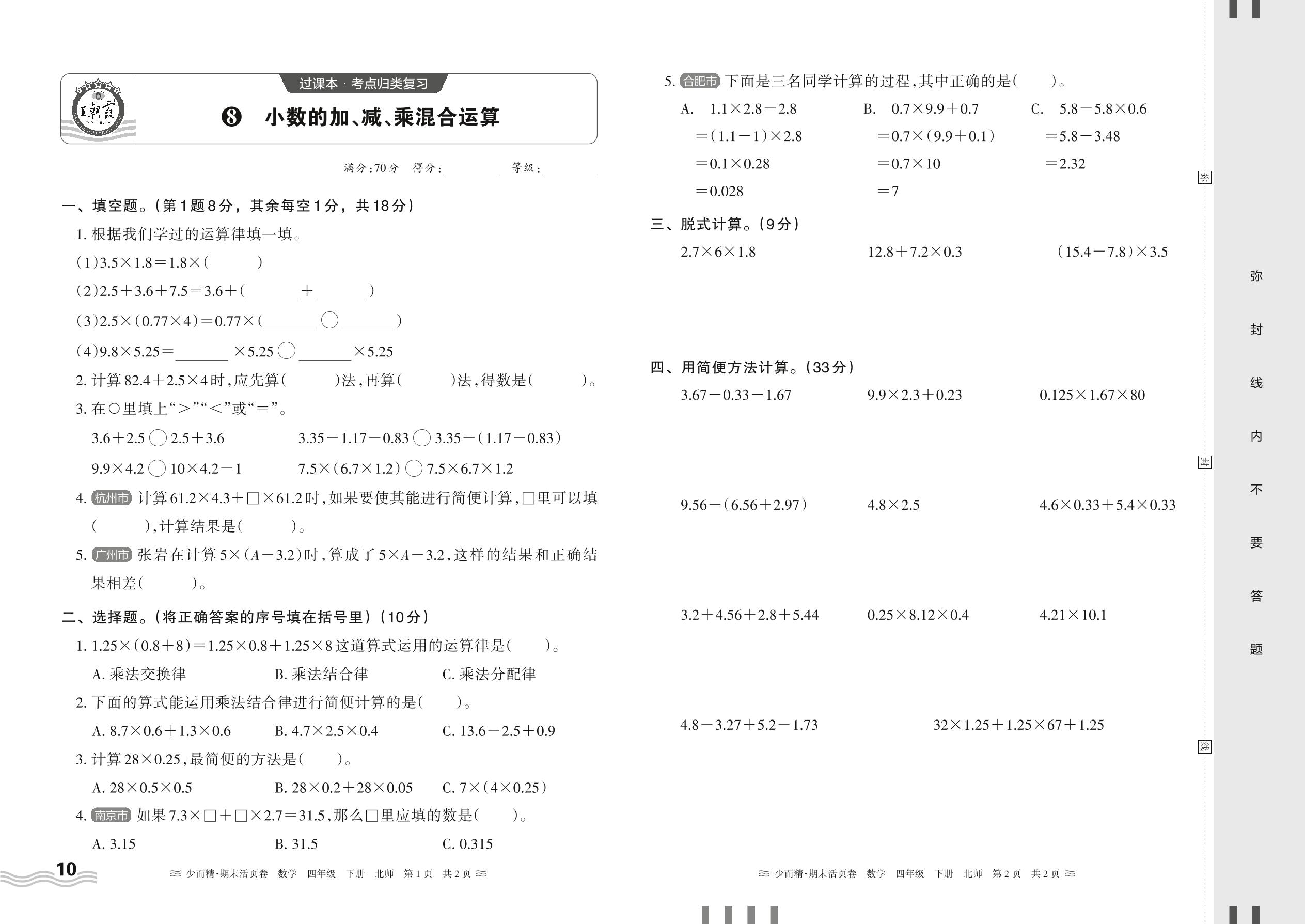 2024春下册四年级数学北师版 期末过课本HY版·小数的加、减、乘混合运算【8】
