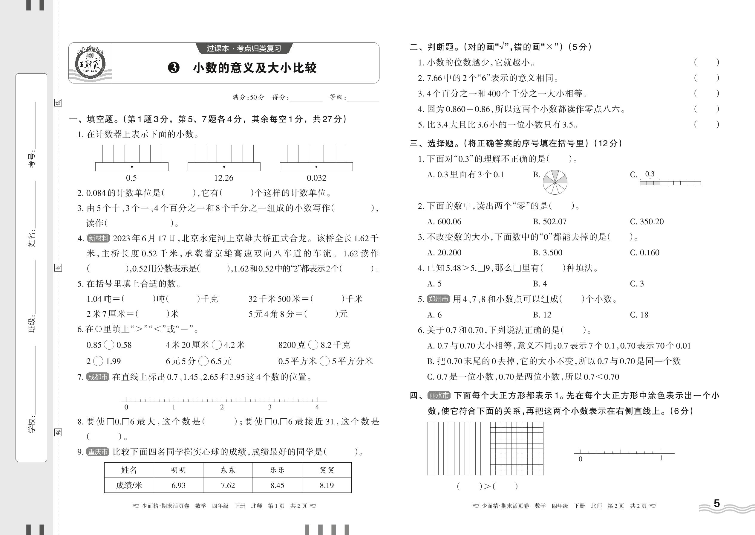 2024春下册四年级数学北师版 期末过课本HY版·小数的意义及大小比较【3】