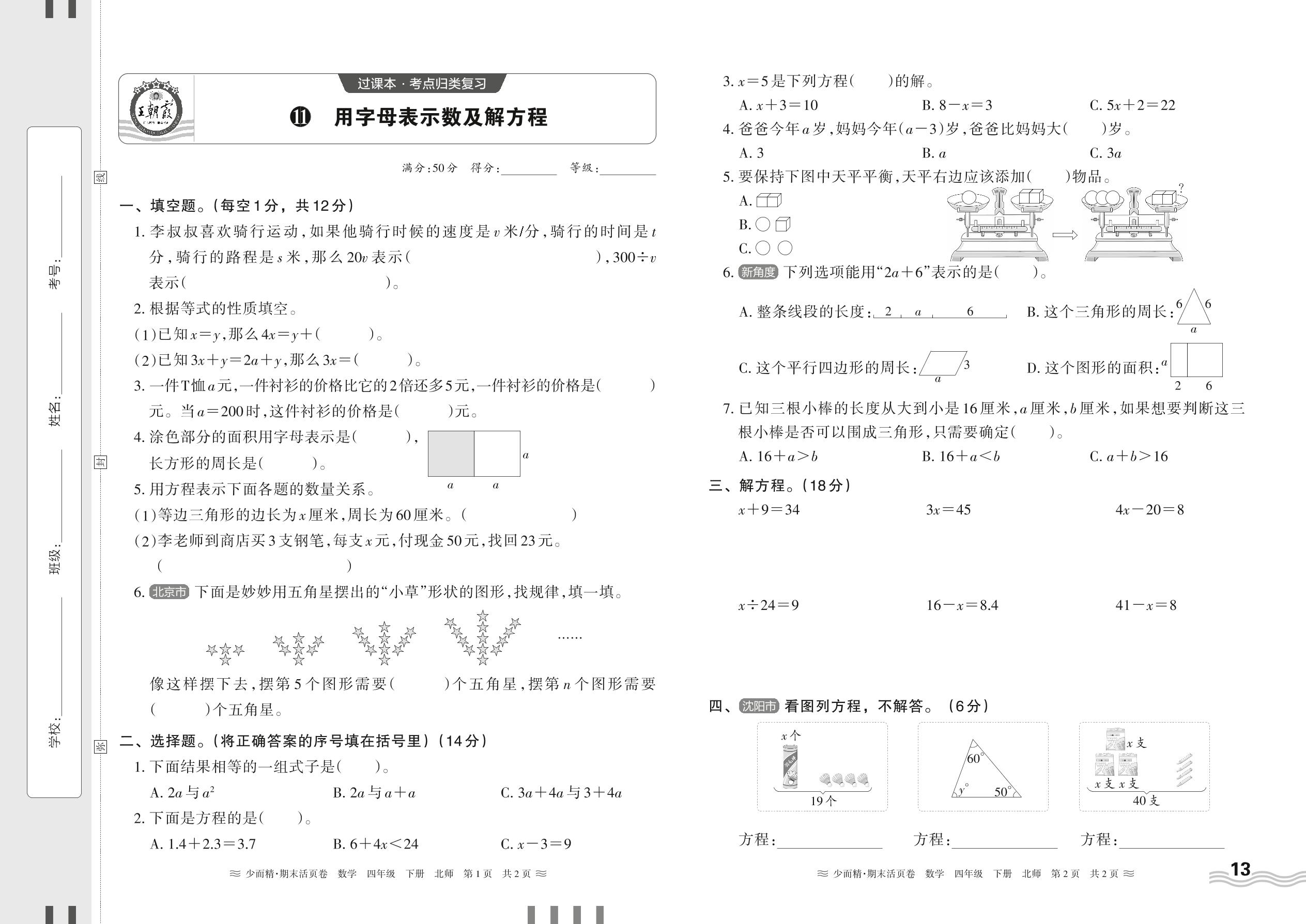 2024春下册四年级数学北师版 期末过课本HY版·用字母表示数及解方程【11】