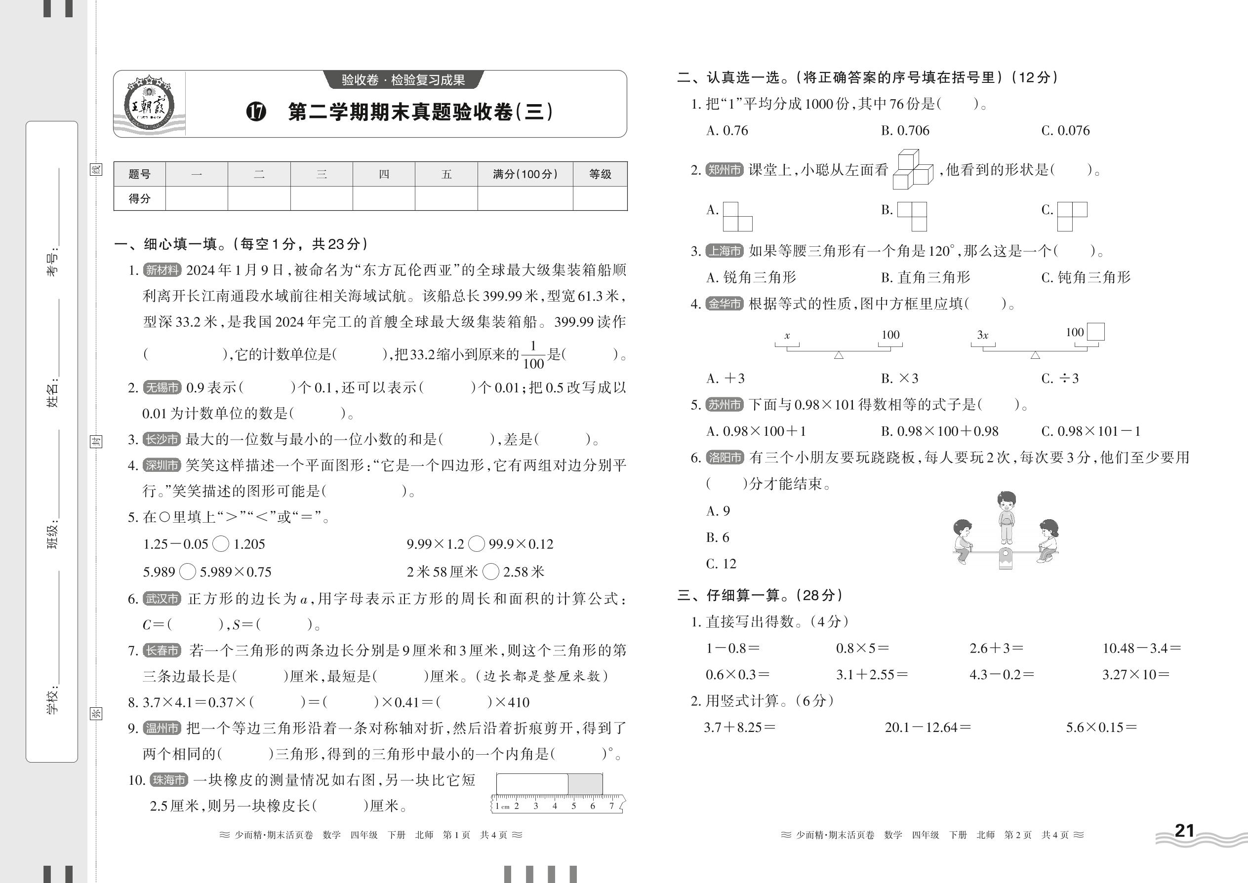 2024春下册四年级数学北师版 第二学期期末真题验收卷(三)