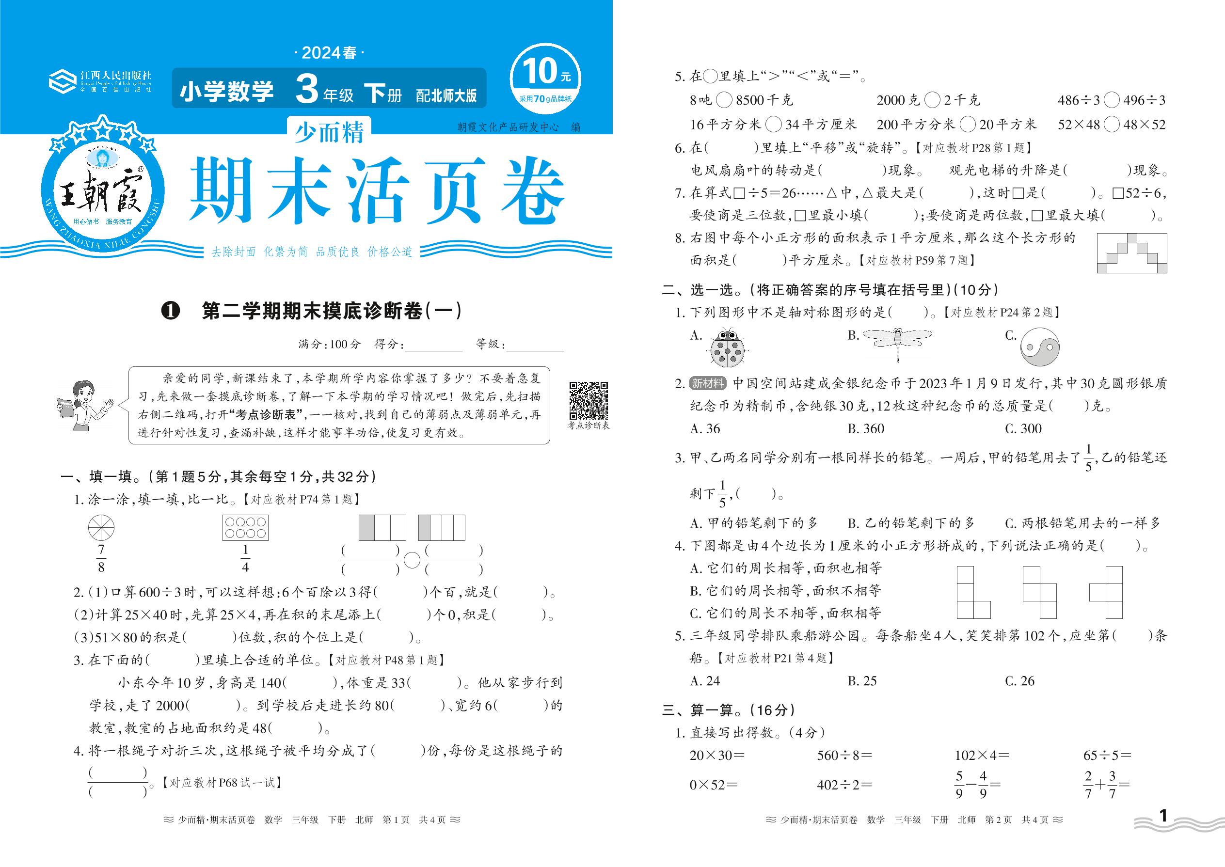 2024春下册三年级数学北师版 第二学期期末摸底诊断卷(一)