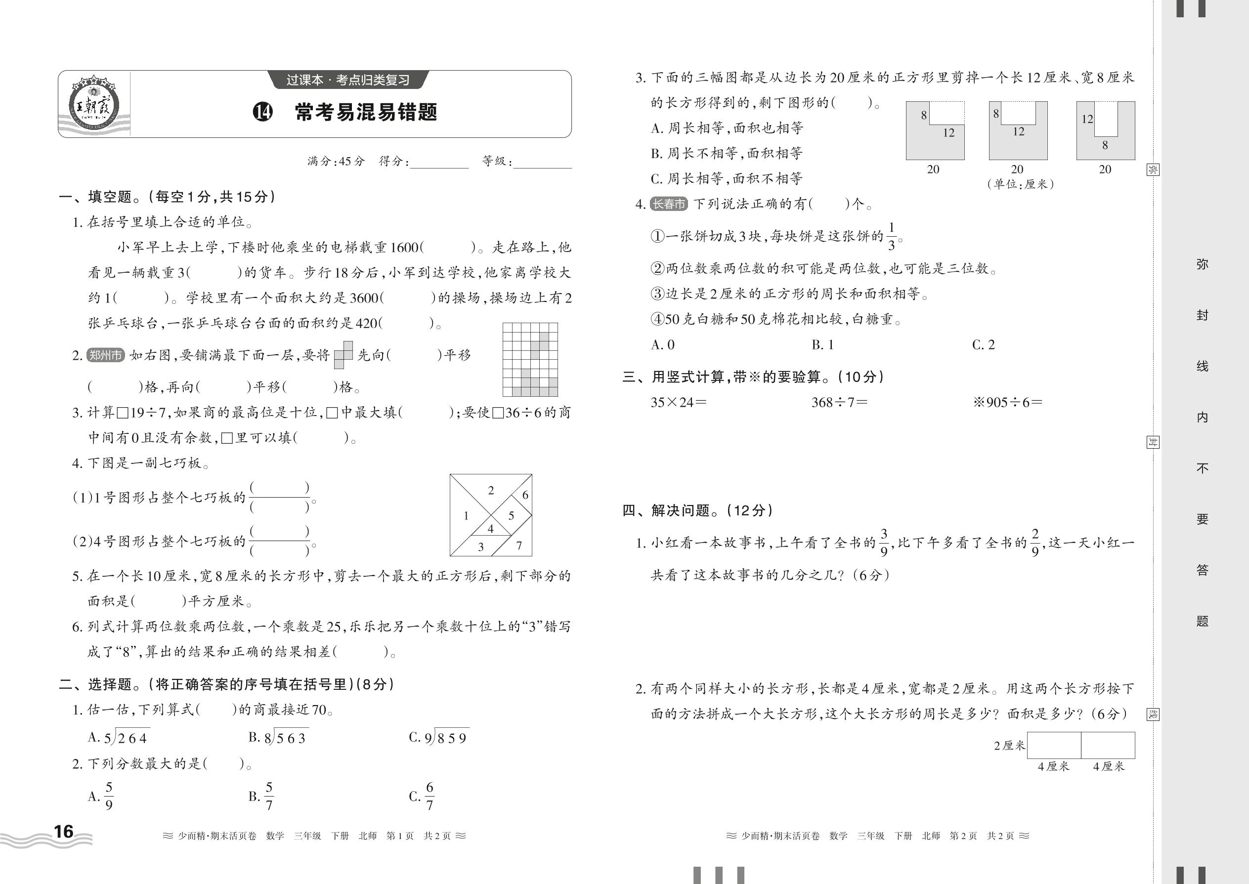 2024春下册三年级数学北师版 期末过课本HY版·常考易混易错题【14】