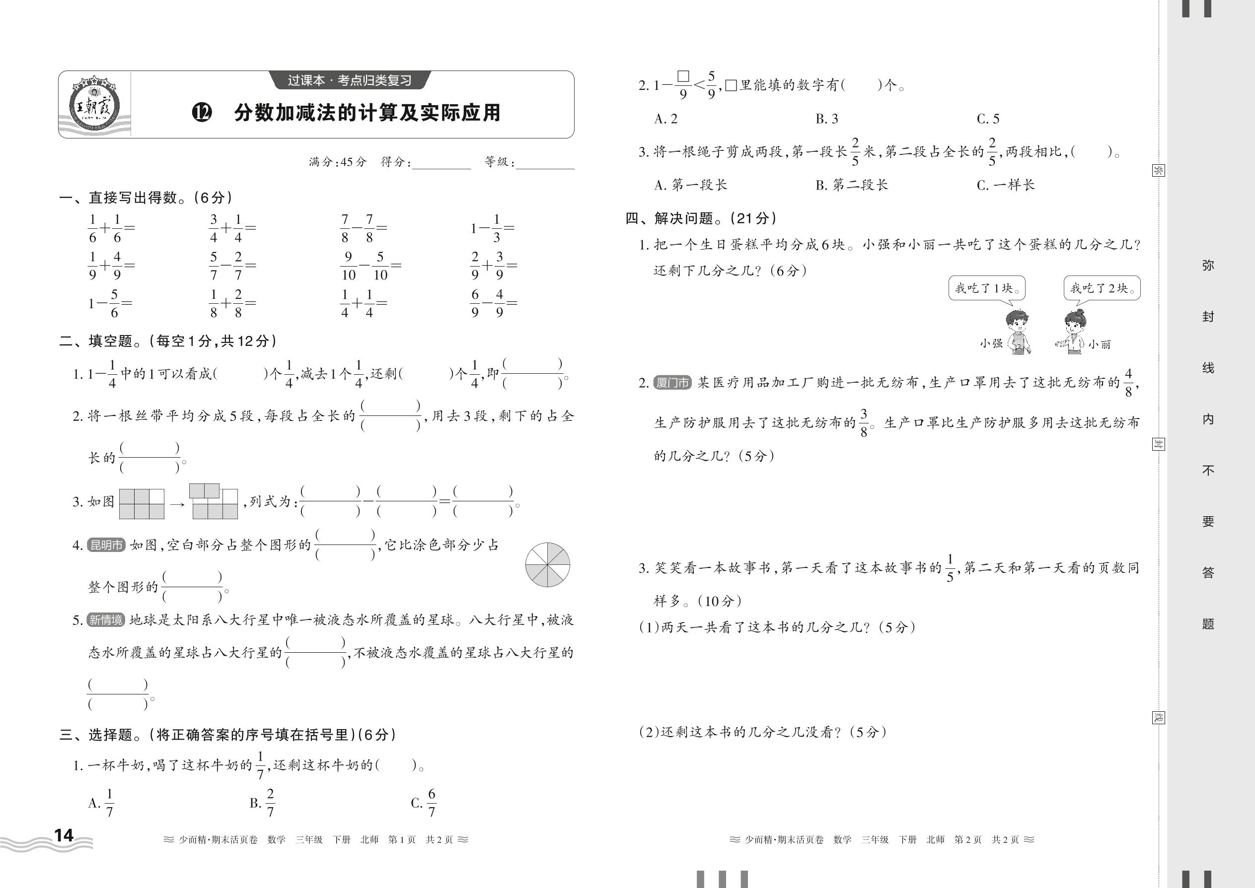 2024春下册三年级数学北师版 期末过课本HY版·分数加减法的计算及实际应用【12】