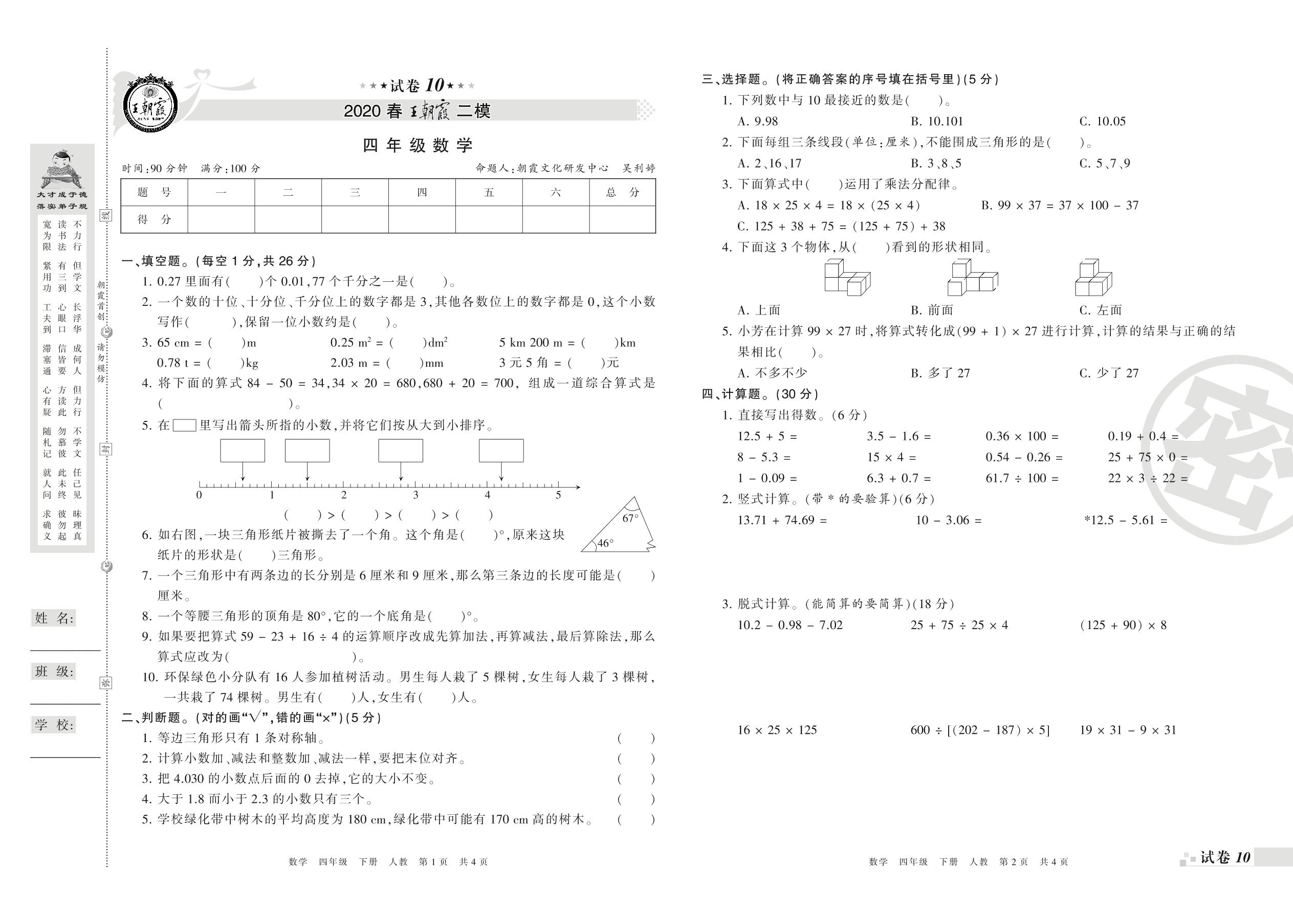 王朝霞期末模拟卷四年级下册数学(人教版)_R210804143750【10】