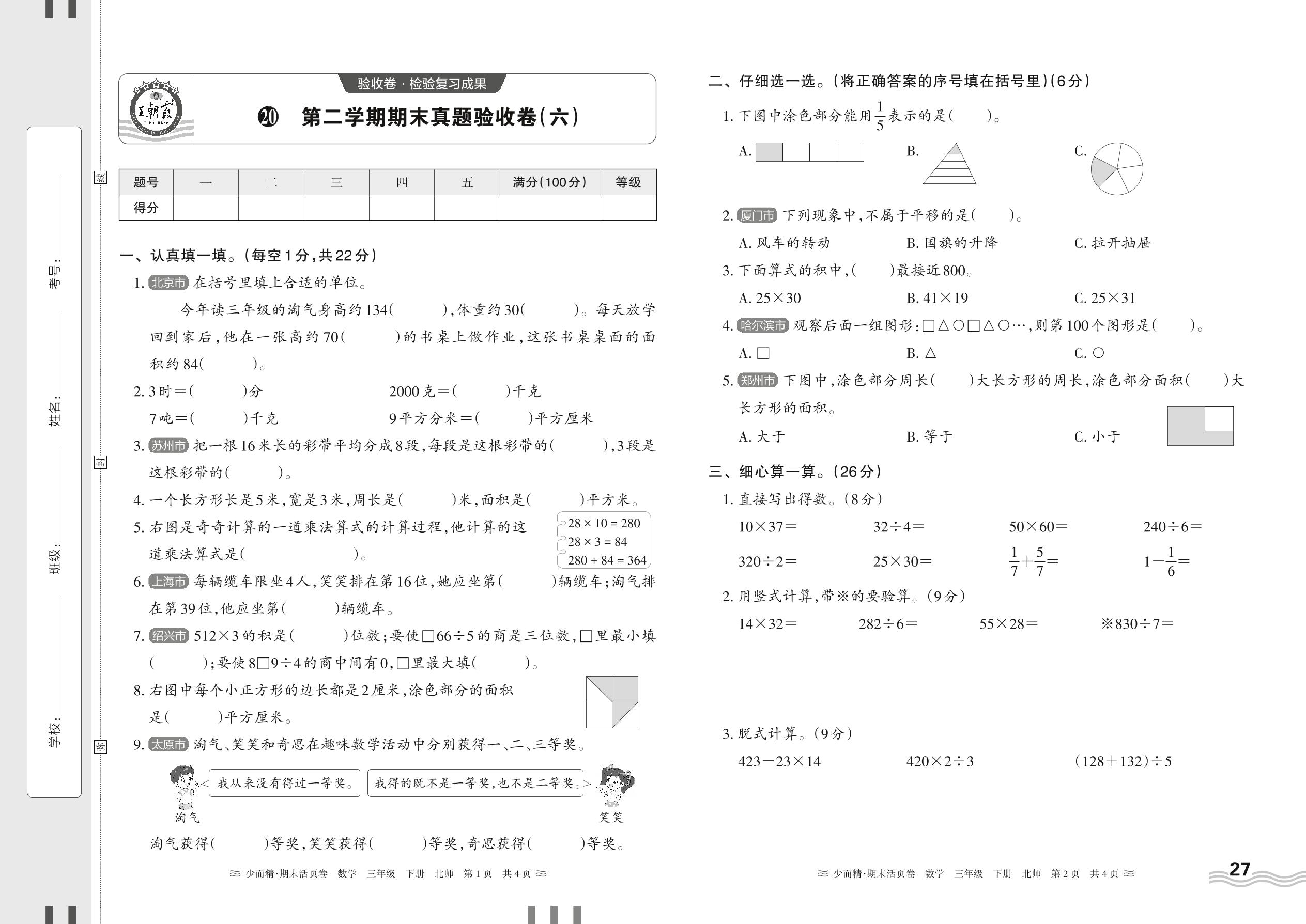 三年级数学北师版下册期末卷
