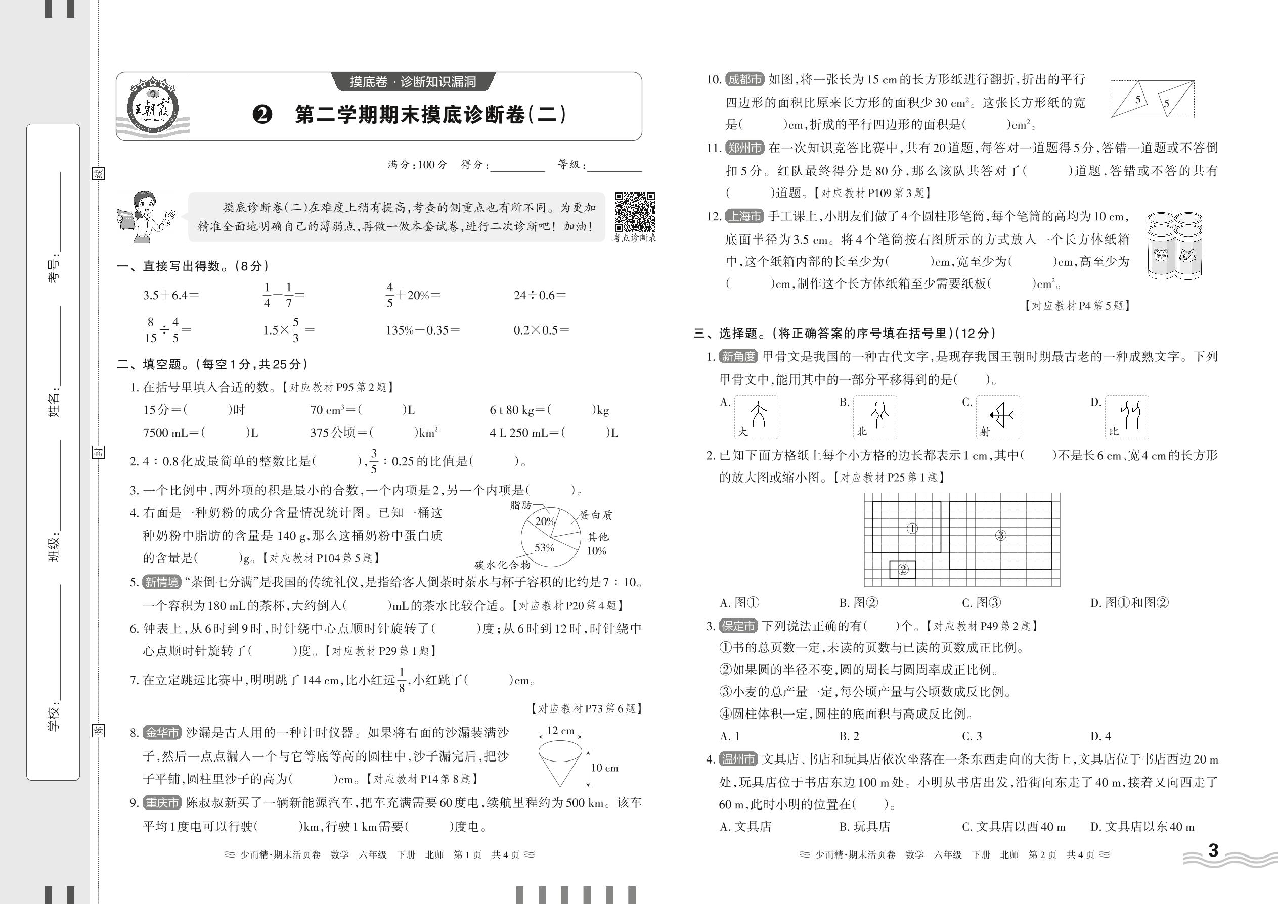 2024春下册六年级数学北师版 第二学期期末摸底诊断卷(二)