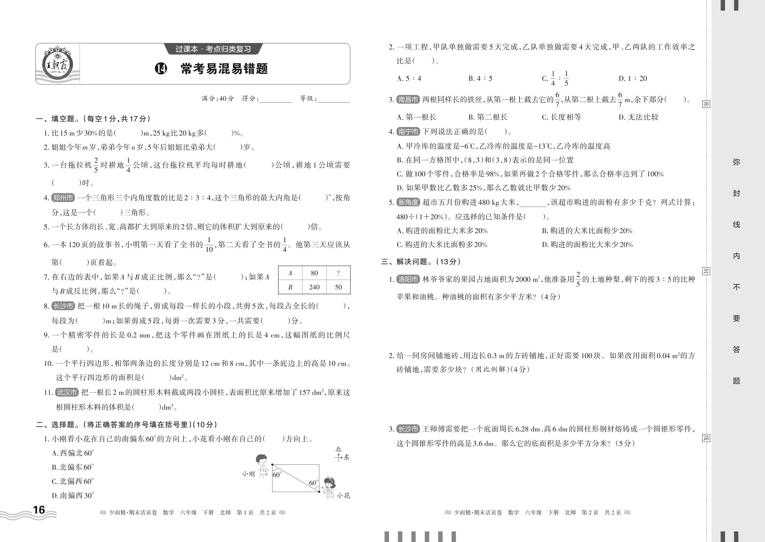 2024春下册六年级数学北师版 期末过课本HY版·常考易混易错题【14】