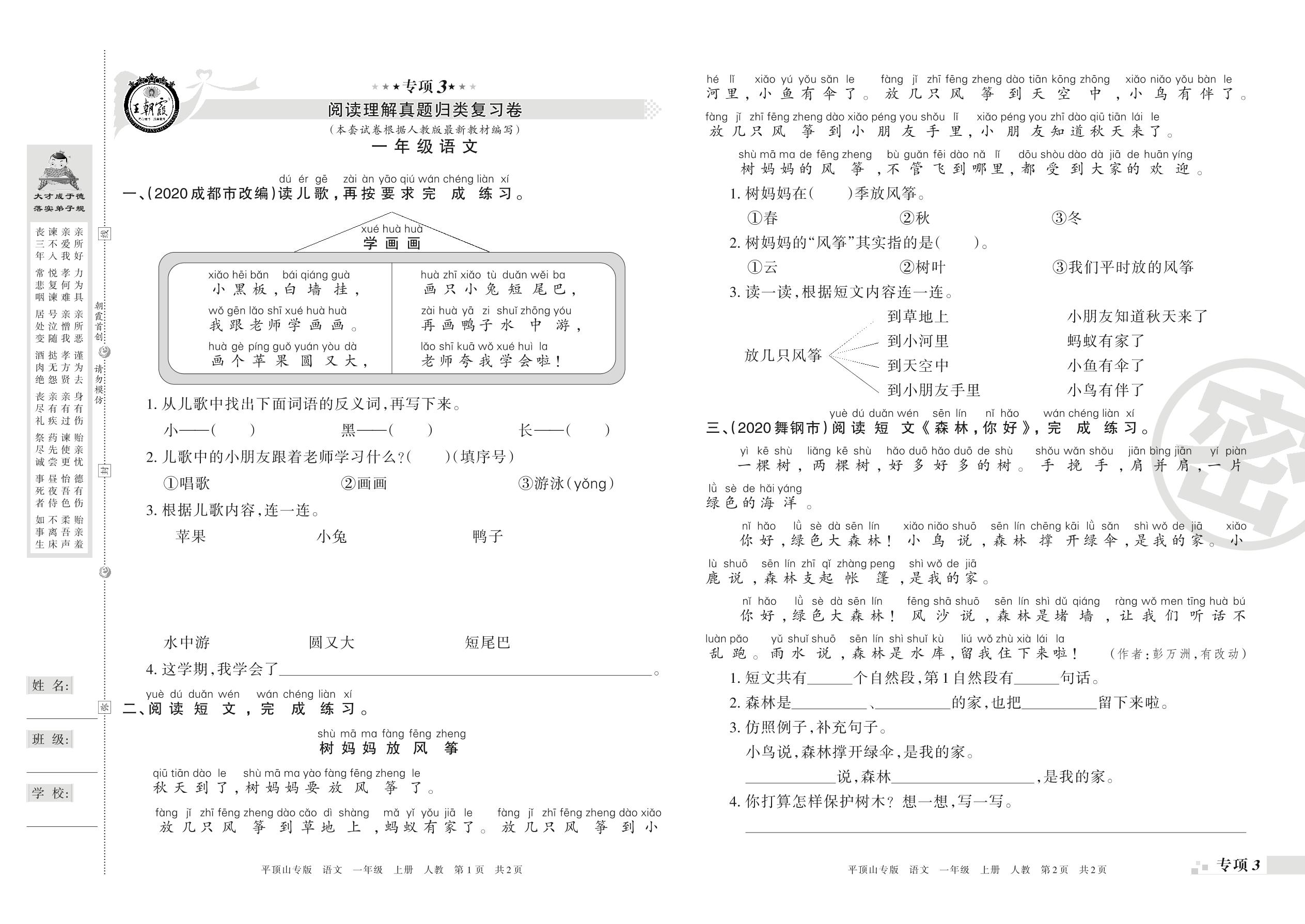 王朝霞期末专项卷——阅读理解、写话真题归类复习一年级上册语文(人教版)_R210731173841【0】