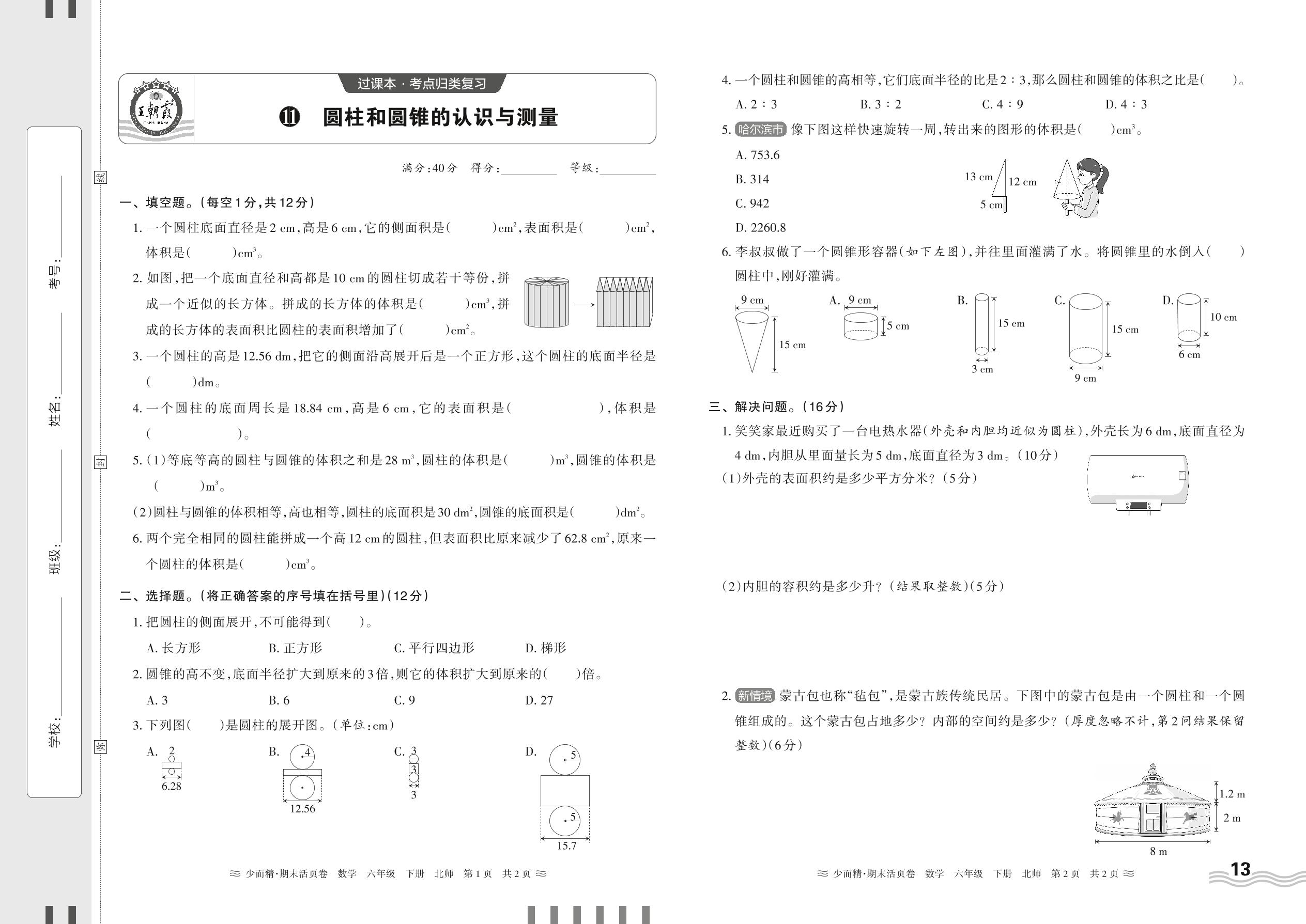 2024春下册六年级数学北师版 期末过课本HY版·圆柱和圆锥的认识与测量【11】