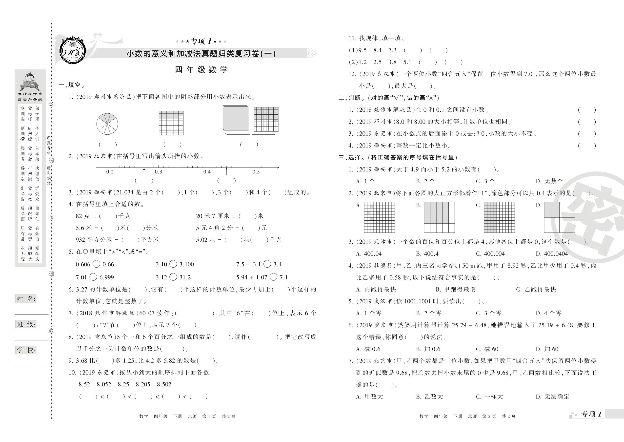 王朝霞期末专项卷——小数的意义和加减法(一)(二)真题归类复习卷四年级下册数学(北师版)_R210804143802【0】