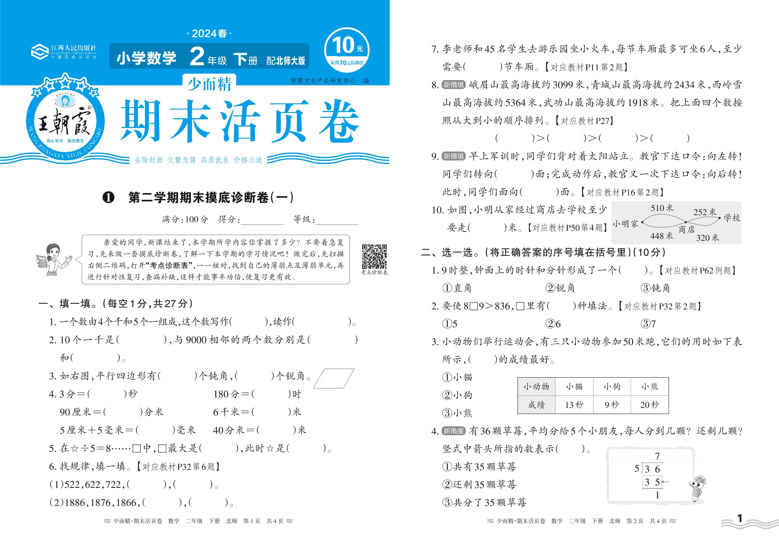 2024春下册二年级数学北师版 第二学期期末摸底诊断卷(一)
