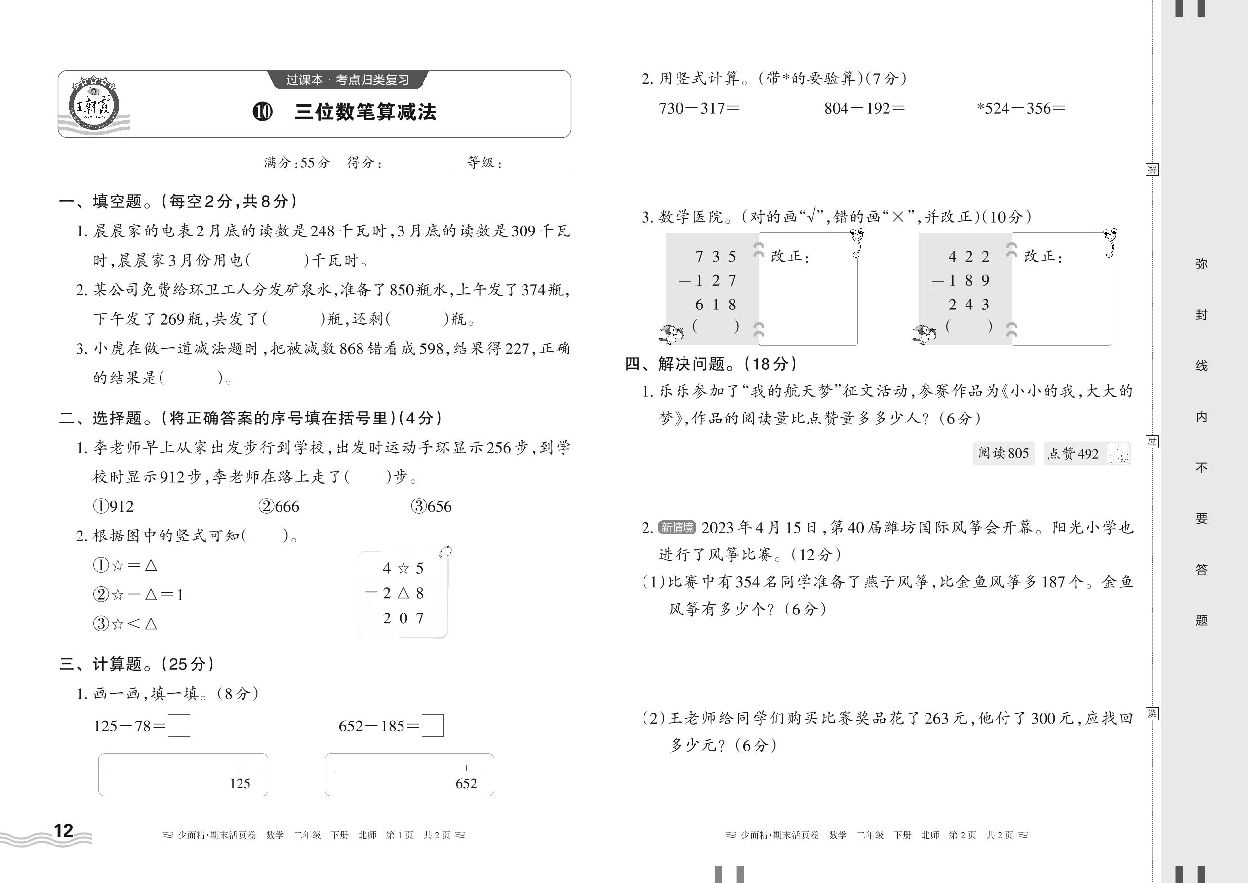 2024春下册二年级数学北师版 期末过课本HY版·三位数笔算减法【10】