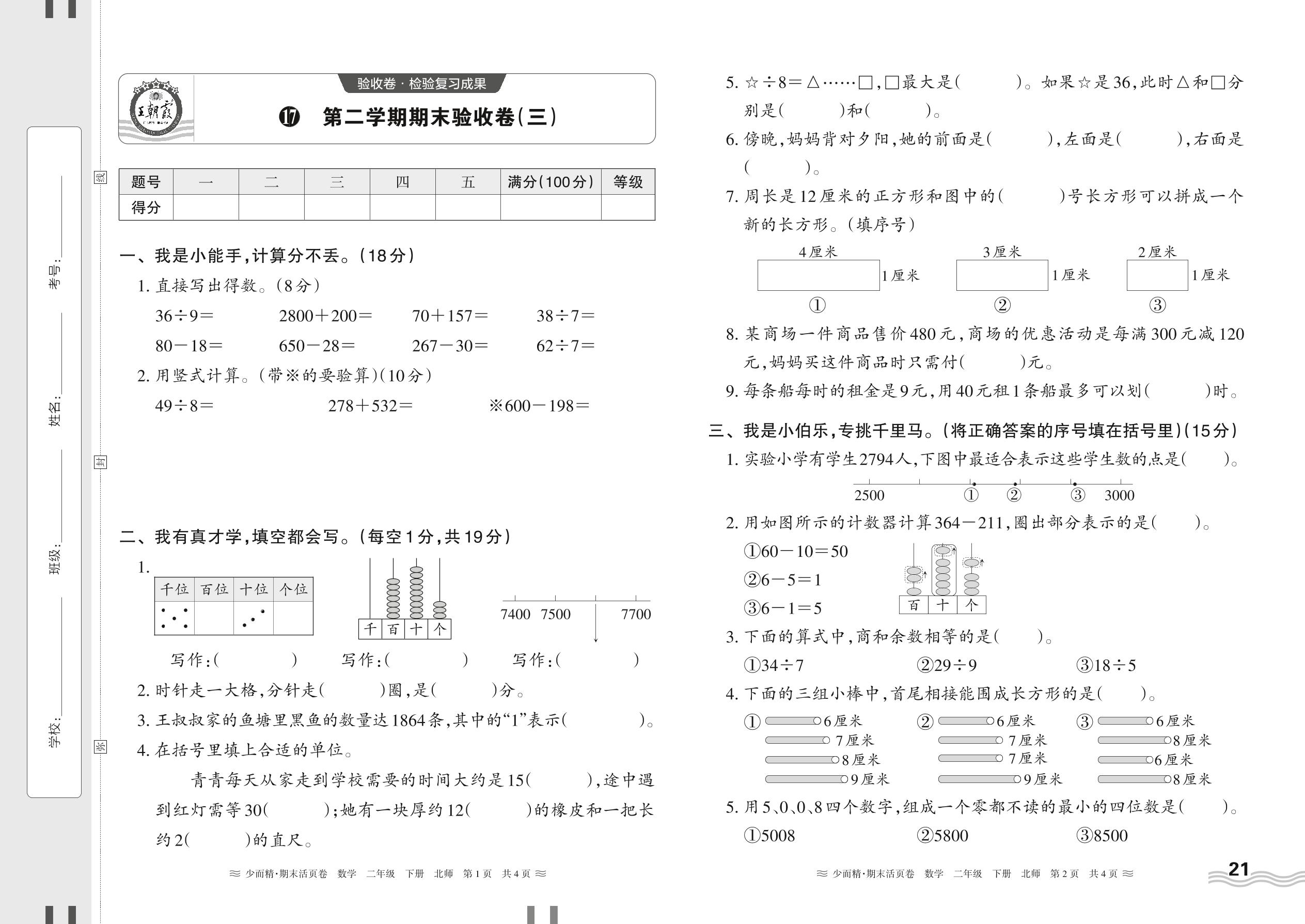2024春下册二年级数学北师版 第二学期期末验收卷(三)