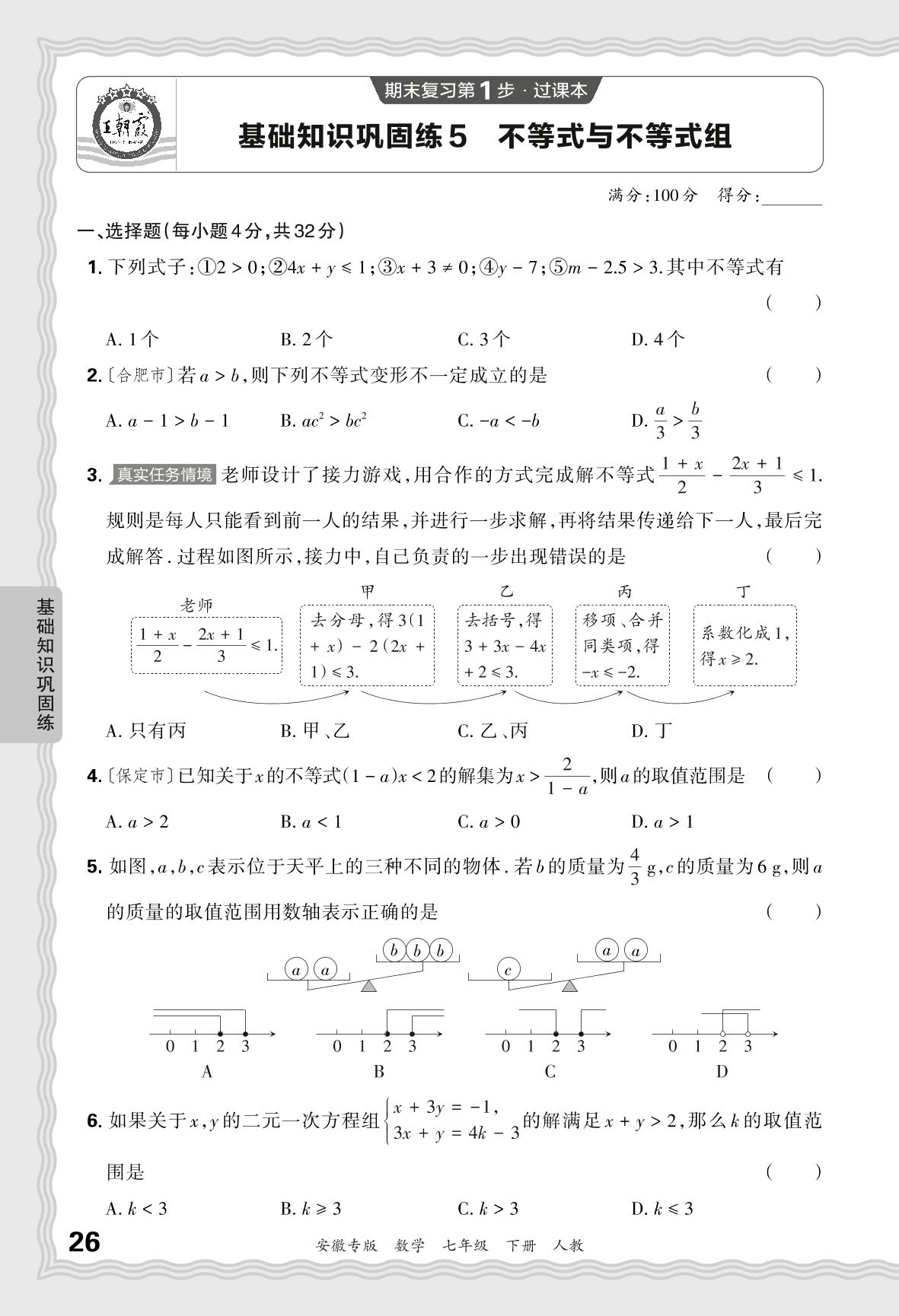 2024春下册七年级数学人教版 期末过课本安徽版·基础知识巩固练 不等式与不等式组【5】