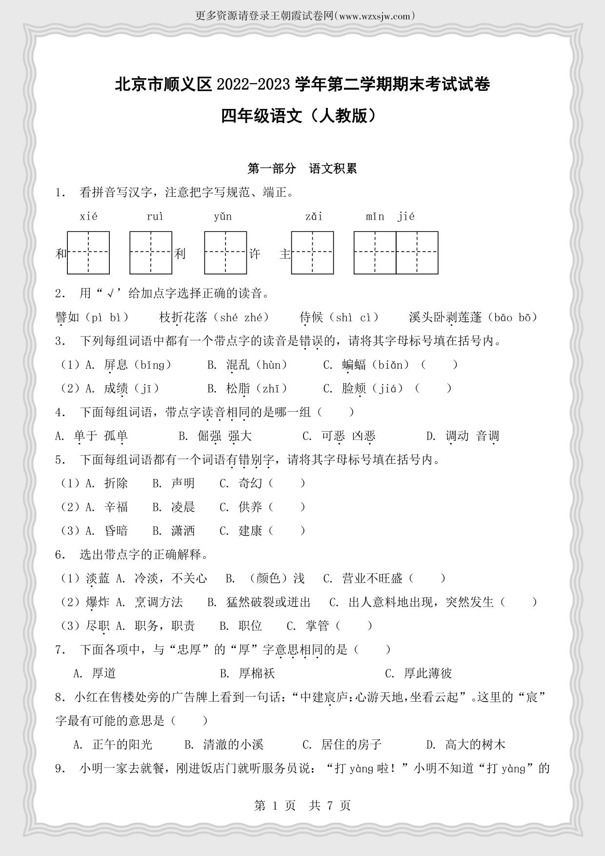 北京市顺义区2022-2023学年第二学期期末考试试卷四年级语文(人教版)