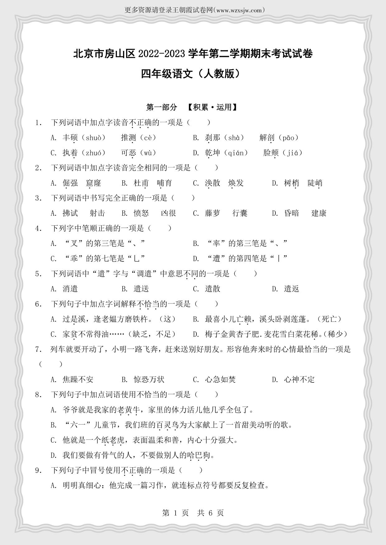 北京市房山区2022-2023学年第二学期期末考试试卷四年级语文(人教版)