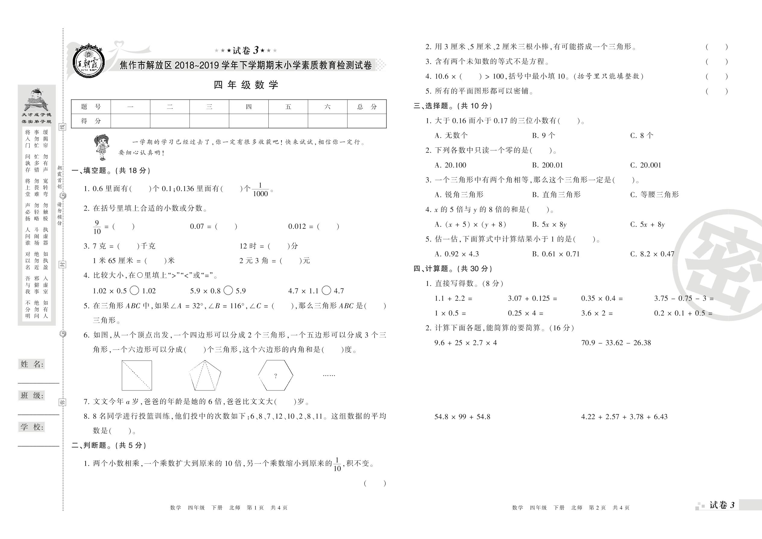 2018-2019学年第二学期焦作市解放区四年级数学试卷(北师版)【3】