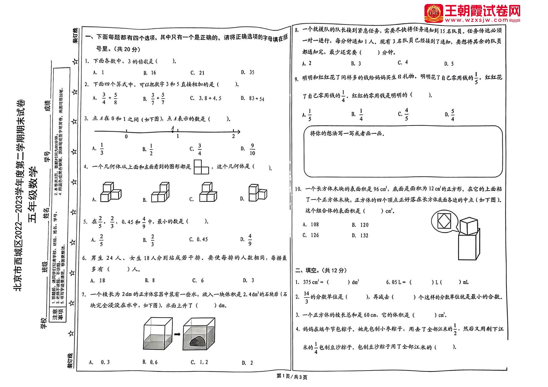北京市西城区2022-2023学年第二学期期末试卷五年级数学(人教版)