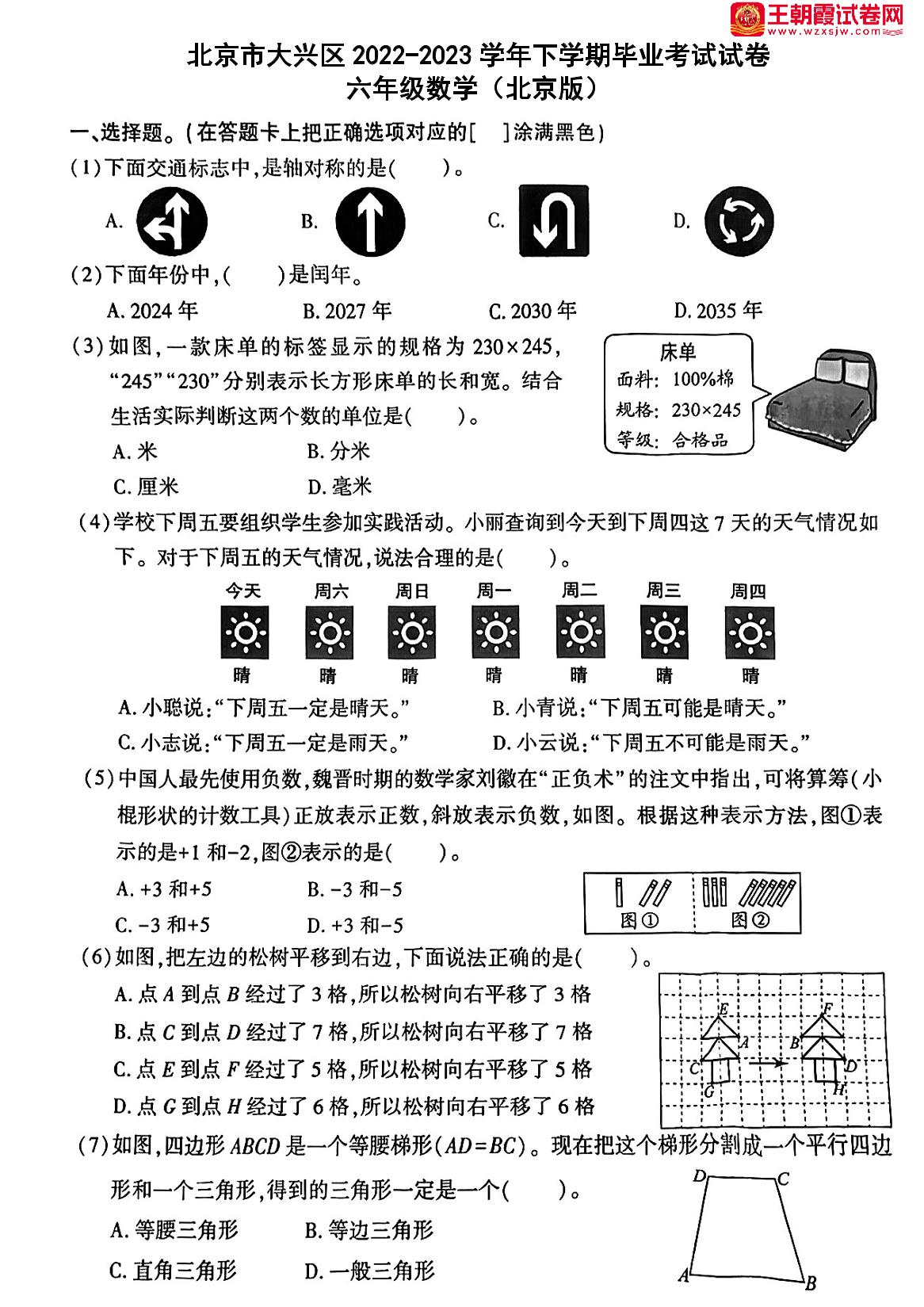 北京市大兴区2022-2023学年六年级下学期毕业考试数学试卷(北京版)