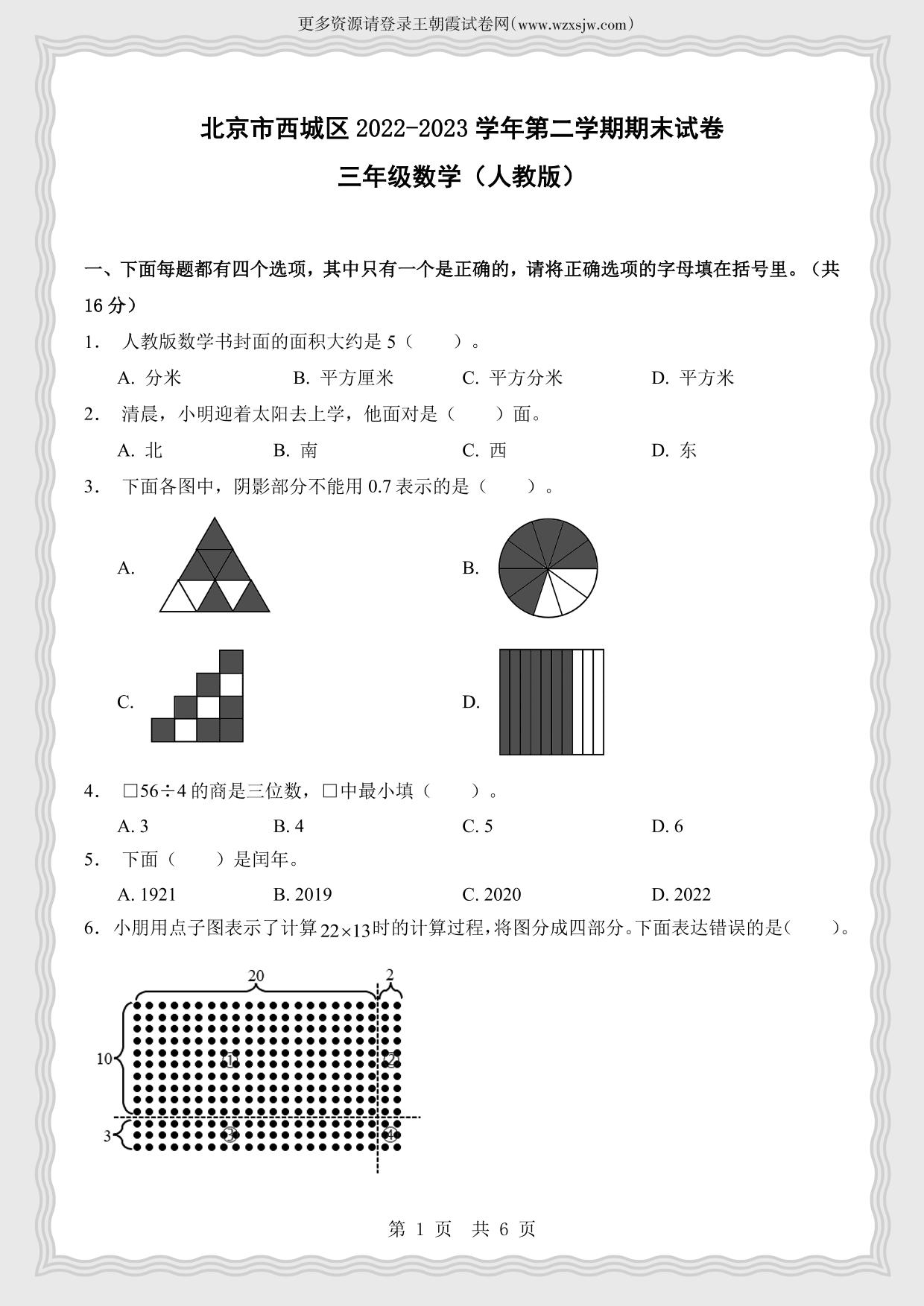 北京市西城区2022-2023学年第二学期期末试卷三年级数学(人教版)