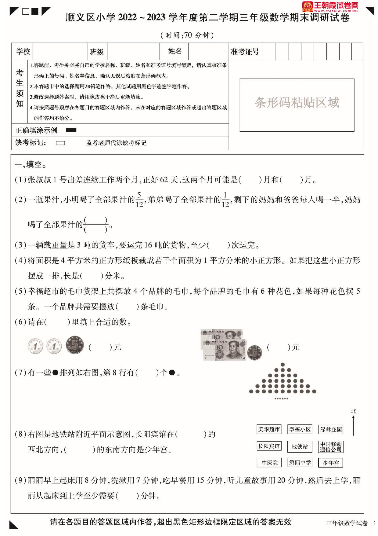 北京市顺义区小学2022-2023学年度第二学期期末调研试卷三年级数学(北京版)