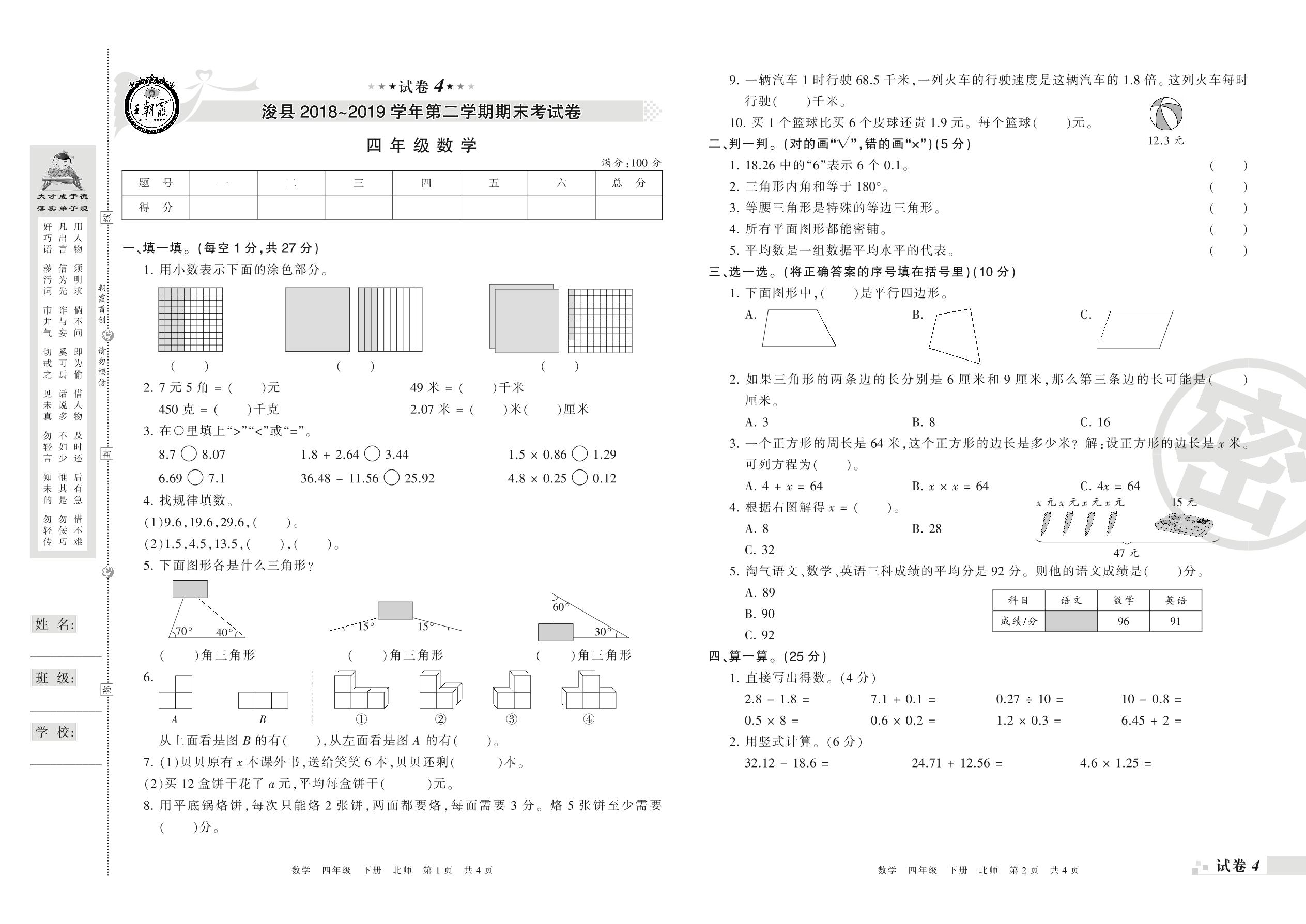 2018-2019学年第二学期鹤壁市浚县四年级数学试卷(北师版)【4】