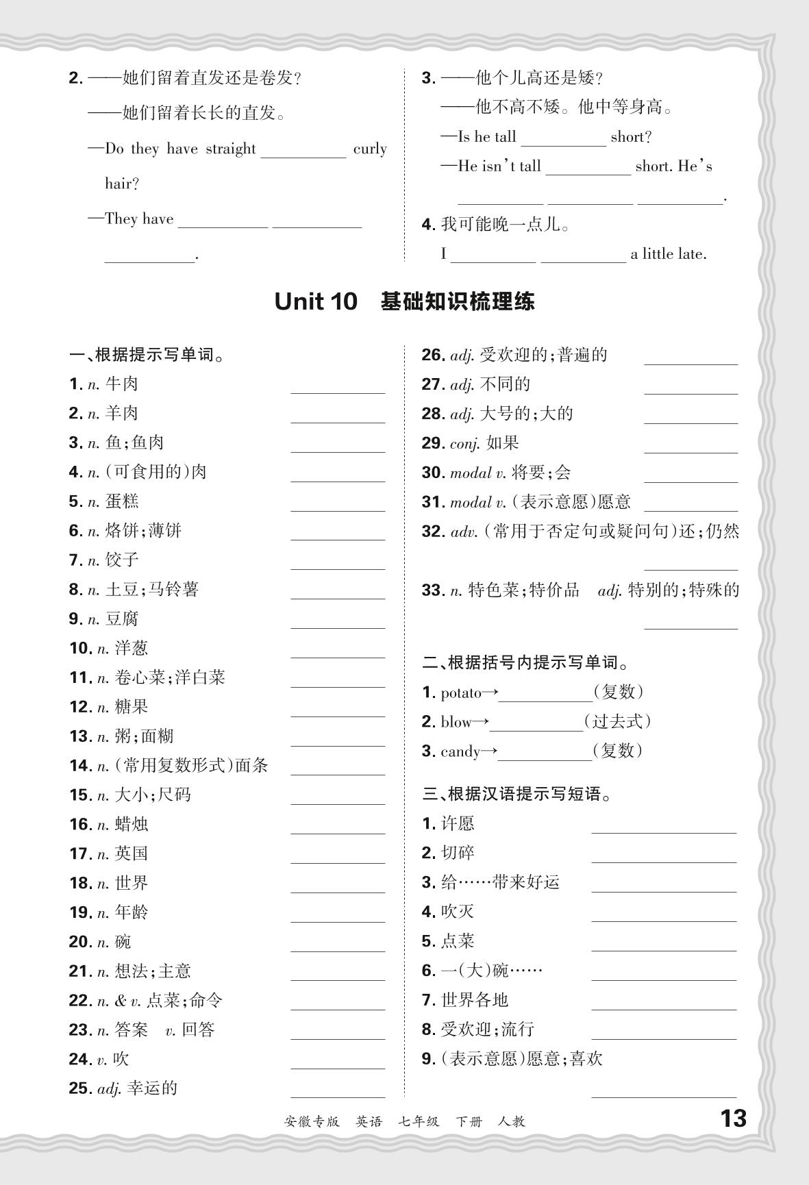 2024春下册七年级英语人教版 期末过课本安徽版·Unit 10 基础知识梳理练