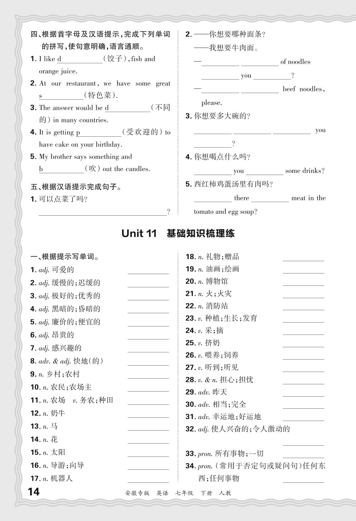 2024春下册七年级英语人教版 期末过课本安徽版·Unit 11 基础知识梳理练