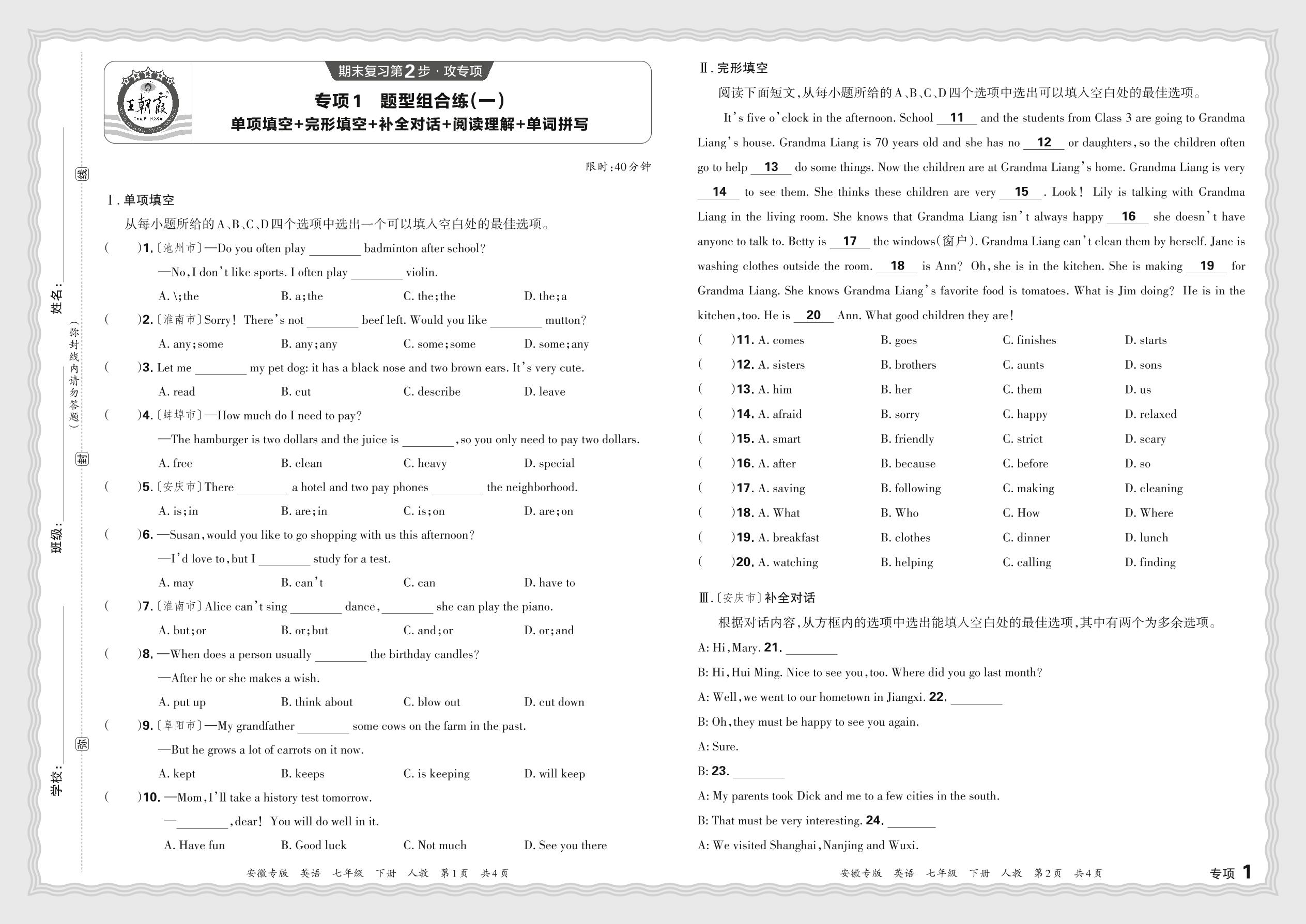 2024春下册七年级英语人教版 期末专项卷安徽版·题型组合练(一)