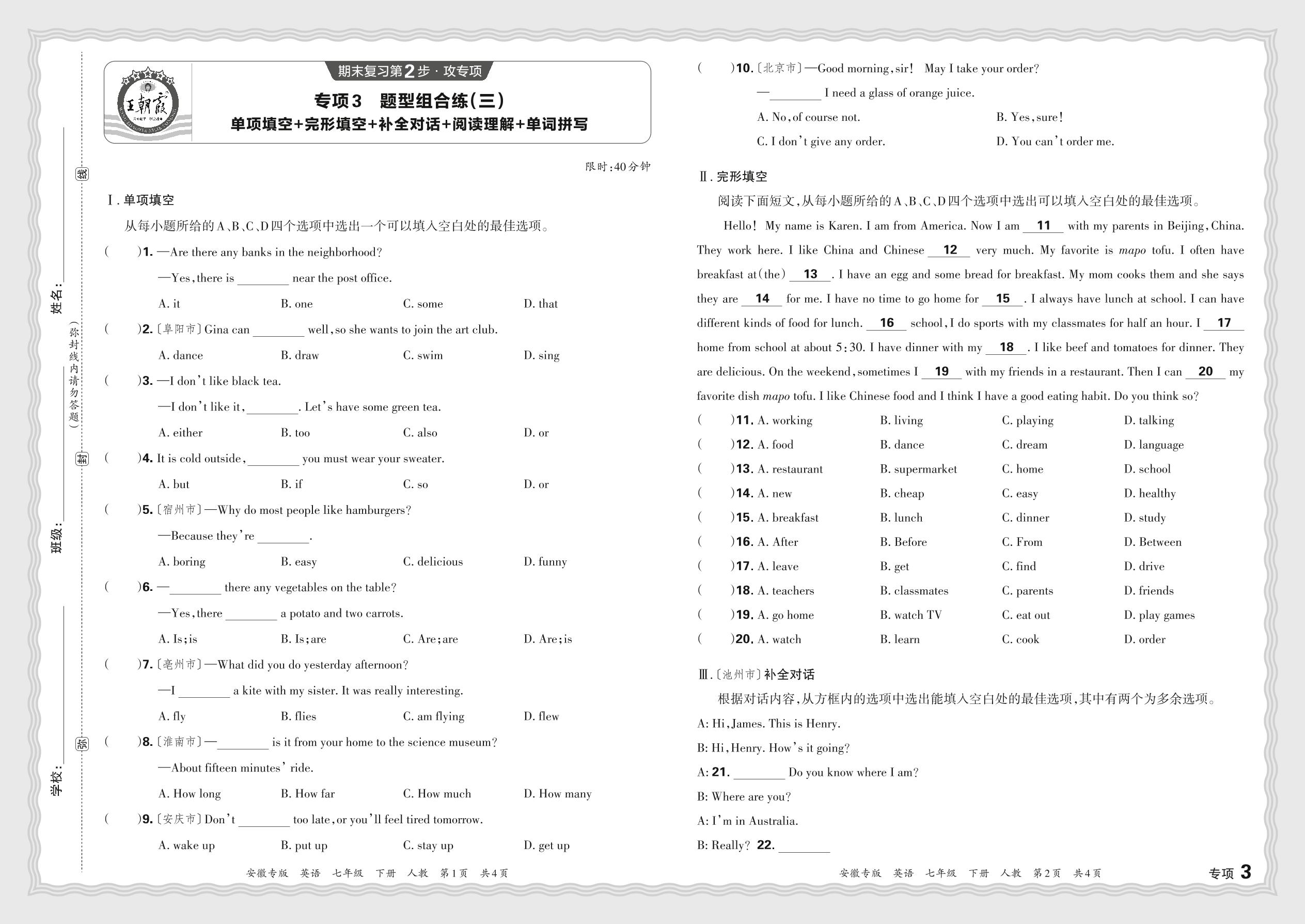 2024春下册七年级英语人教版 期末专项卷安徽版·题型组合练(三)