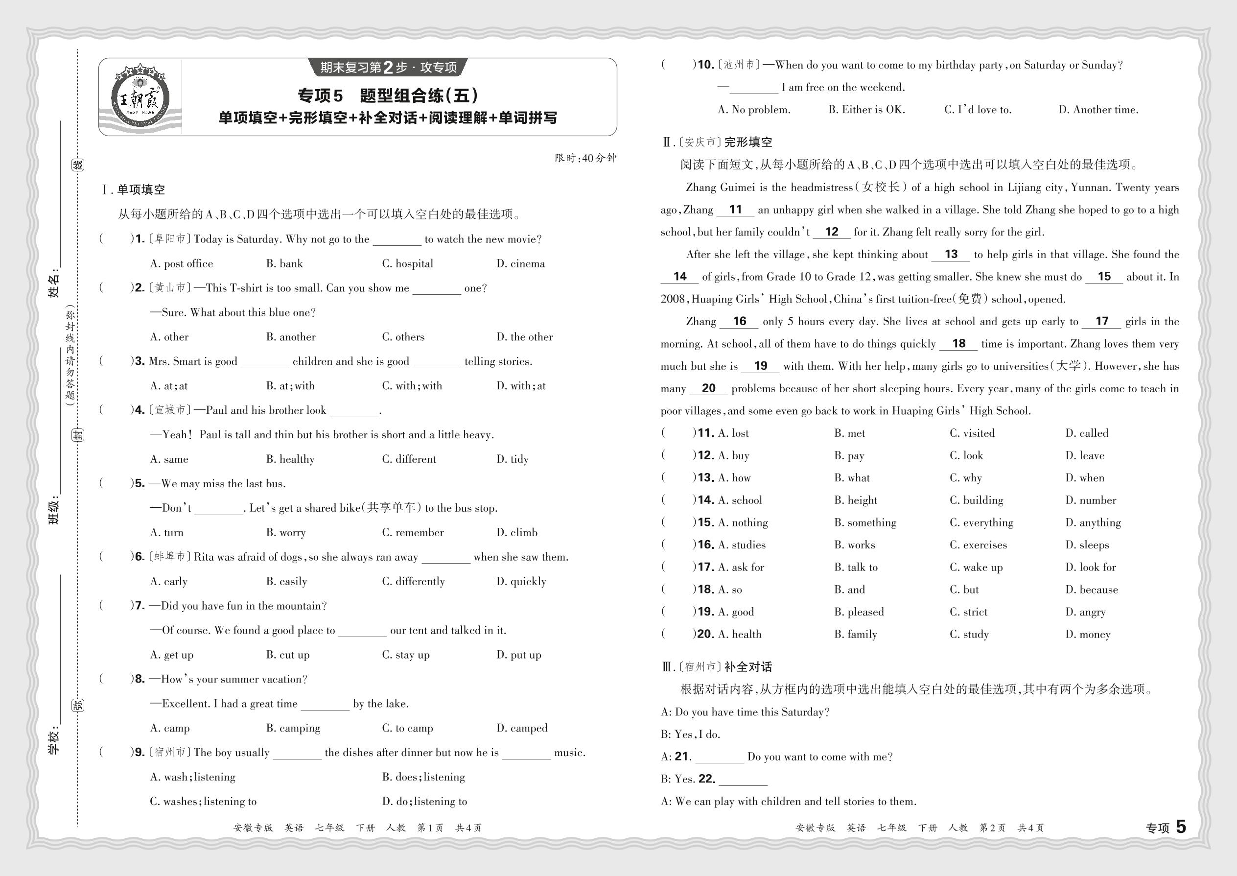 2024春下册七年级英语人教版 期末专项卷安徽版·题型组合练(五)