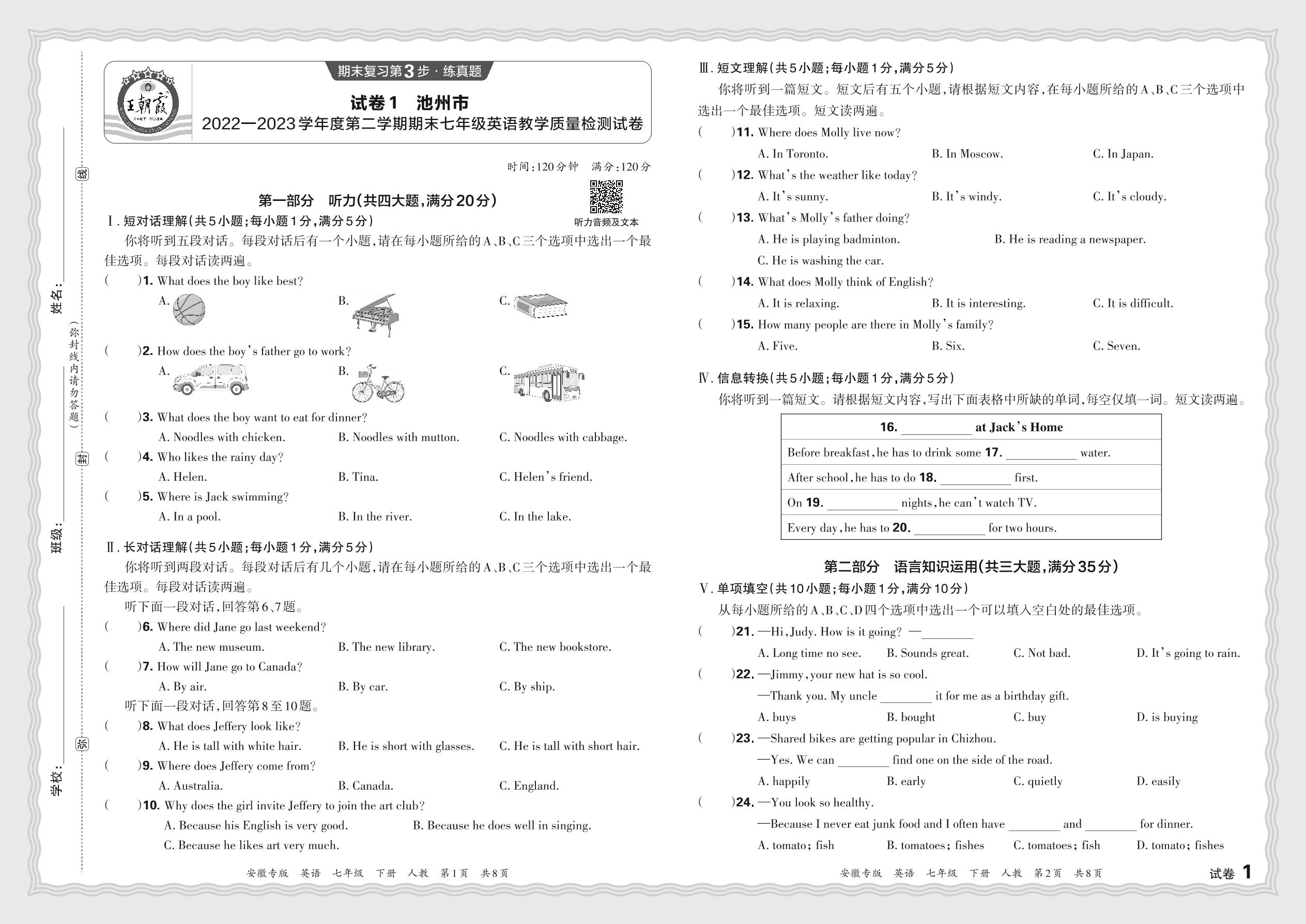 安徽省池州市2022-2023学年度第二学期期末七年级英语教学质量检测试卷(人教版)【1】