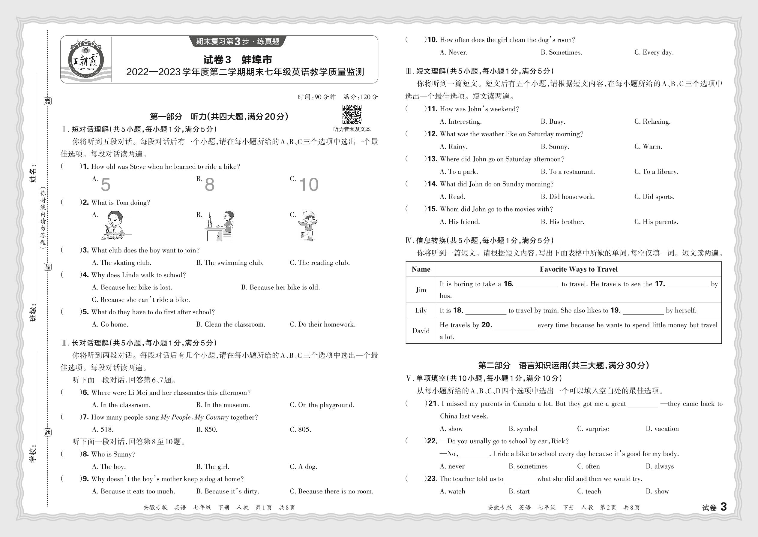 安徽省蚌埠市2022-2023学年度第二学期期末七年级英语教学质量监测(人教版)【3】