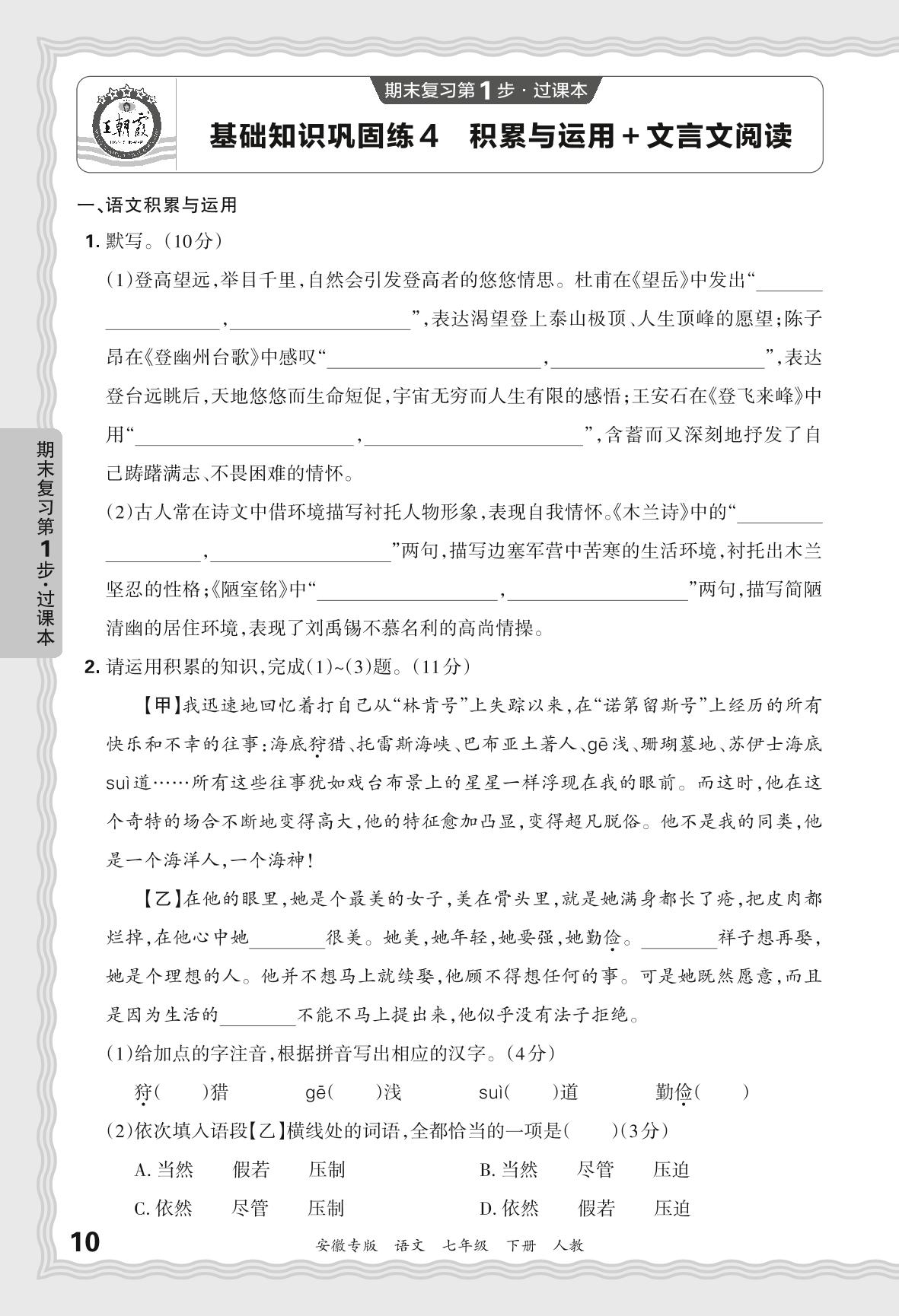 2024春下册七年级语文人教版 期末过课本安徽版·基础知识巩固练 积累与运用+文言文阅读【4】