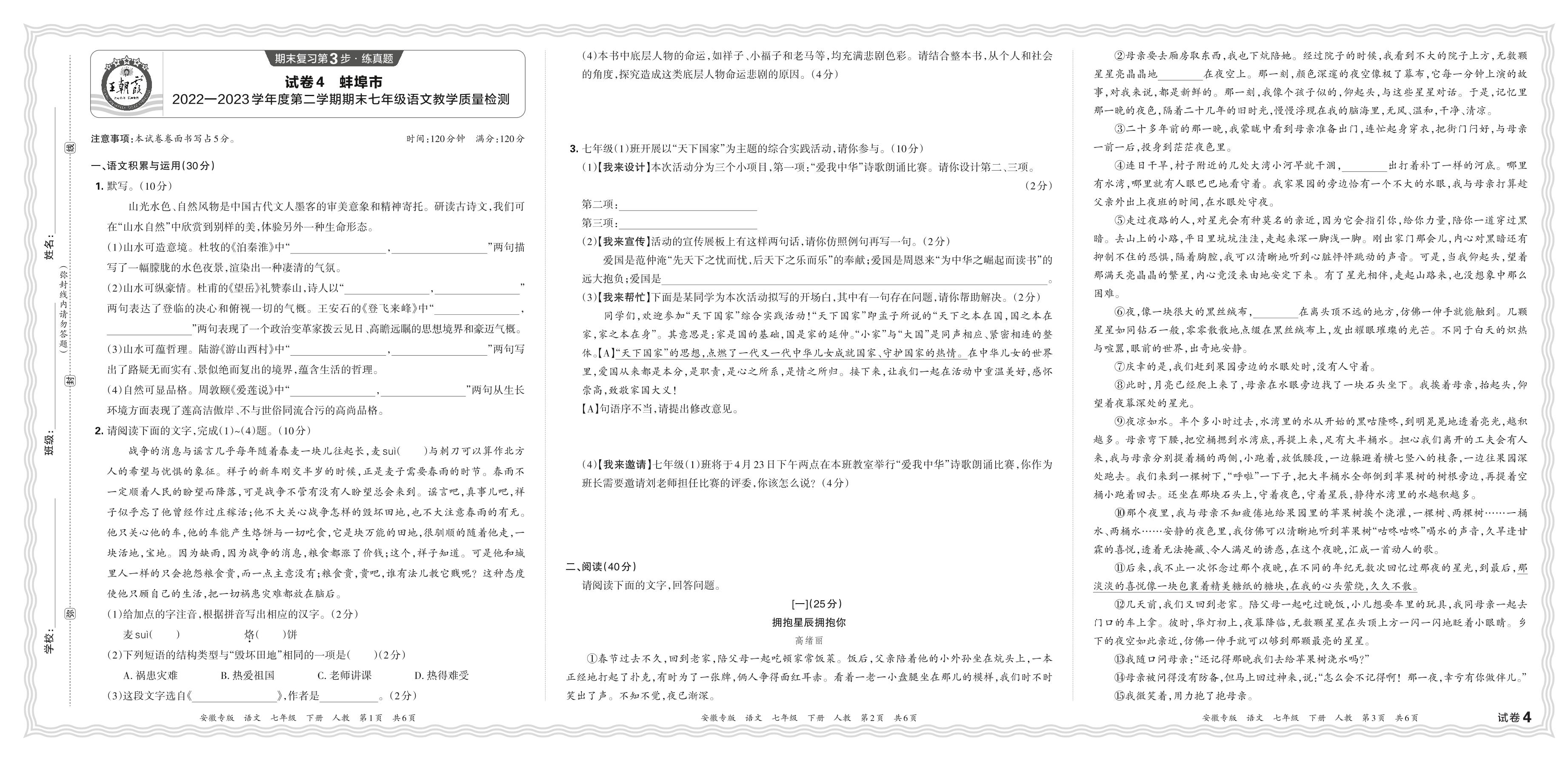 安徽省蚌埠市2022-2023学年度第二学期期末七年级语文教学质量检测(人教版)【4】
