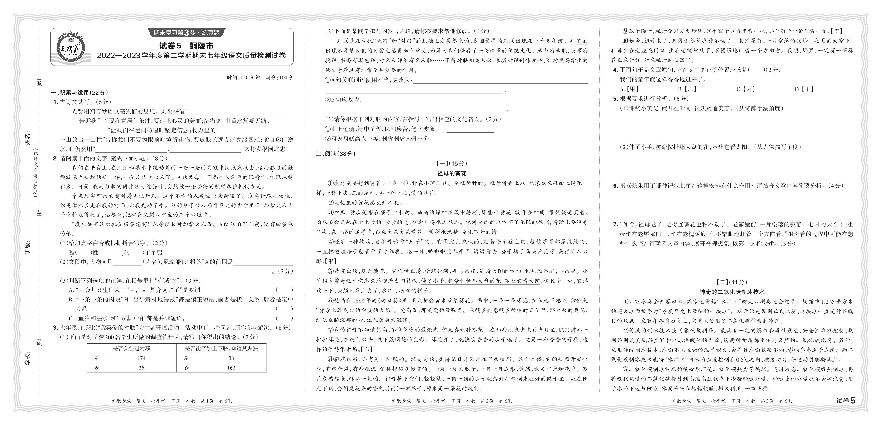 安徽省铜陵市2022-2023学年度第二学期期末七年级语文质量检测试卷(人教版)【5】